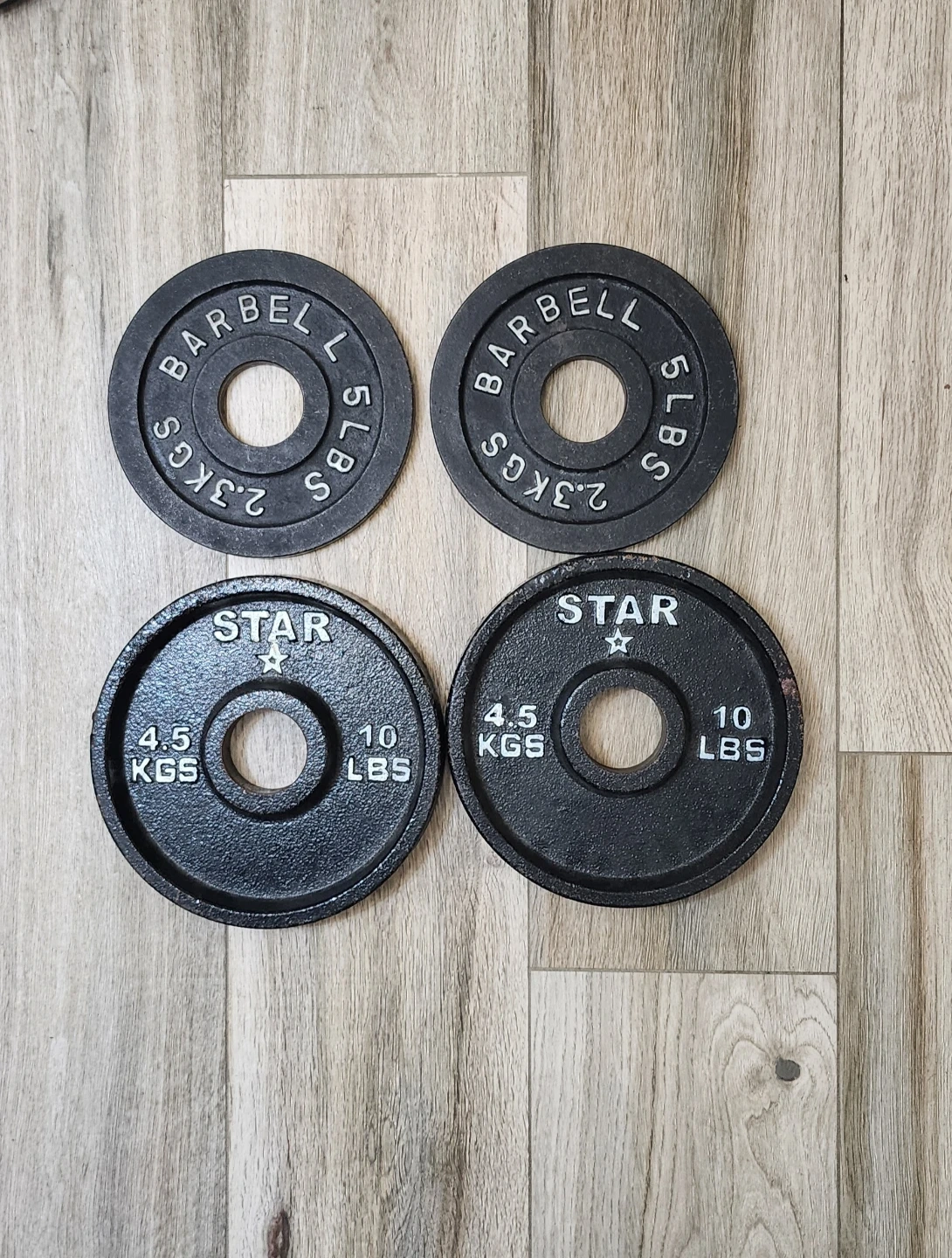 Selling a set of weight plates for your home gym! Includes two 5lb 'Barbell' plates and two 10lb 'Star' plates. Great for adding weight to your workouts