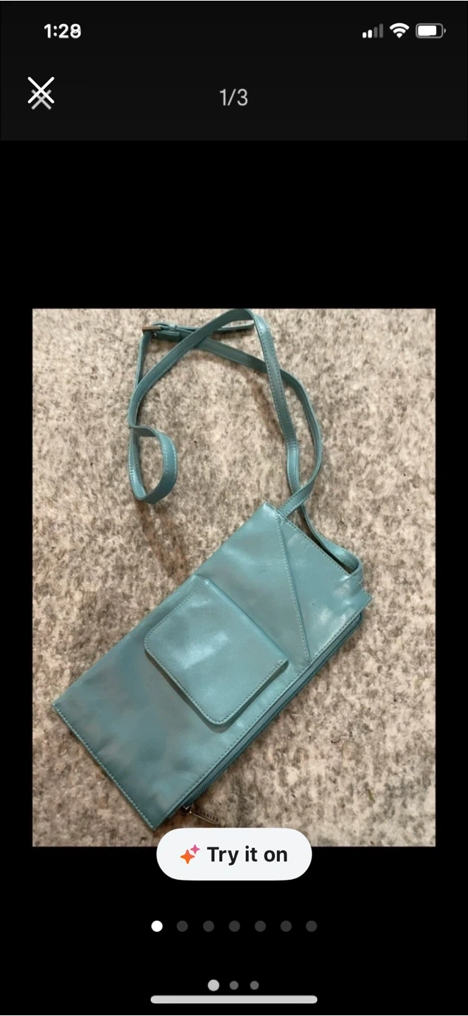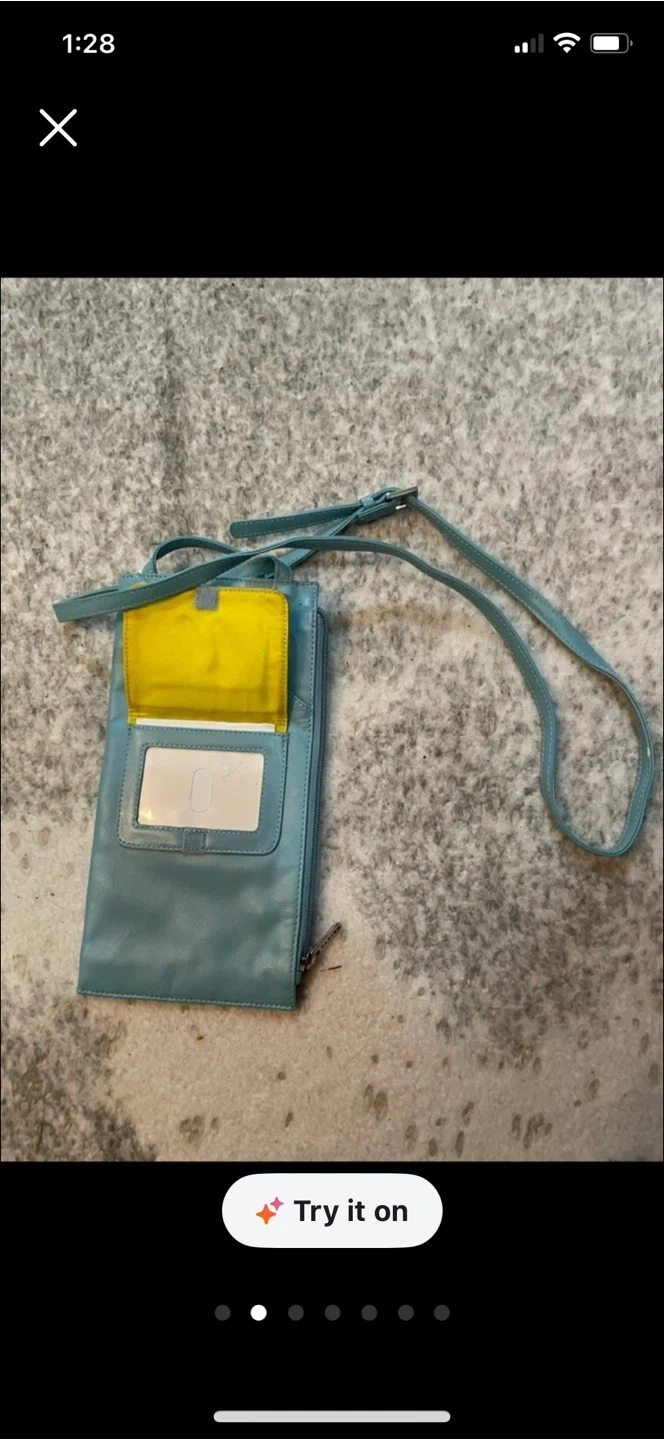 Cute light blue leather crossbody bag! It has a small pocket on the front and a zipper closure. The inside is lined with yellow fabric and has a clear ID slot. Perfect for carrying your essentials!