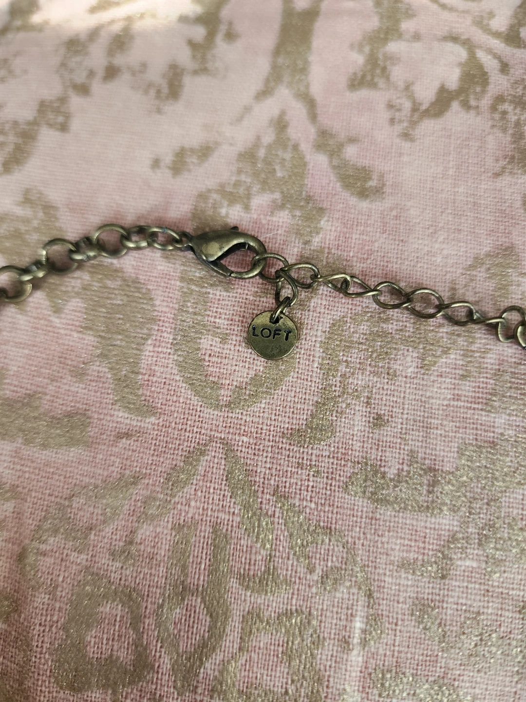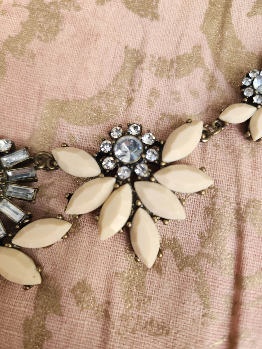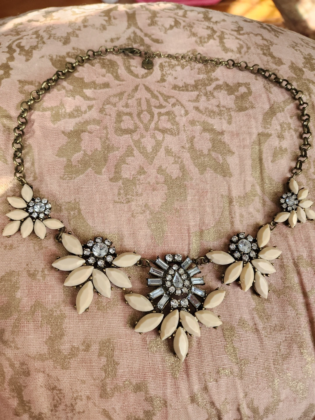 Beautiful LOFT statement necklace with a floral design. It features ivory-colored petals and clear rhinestone accents. Perfect for adding a touch of elegance to any outfit!