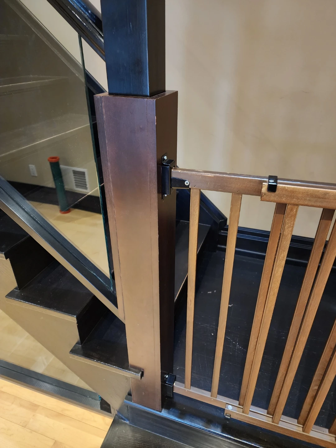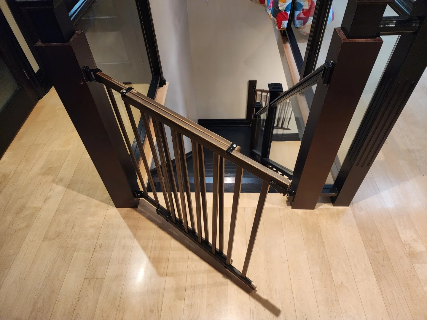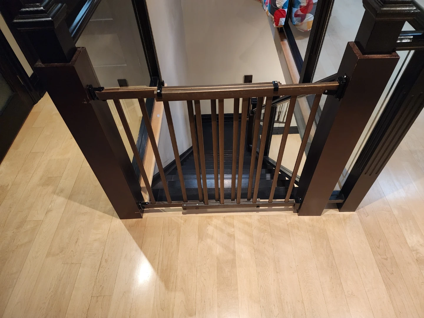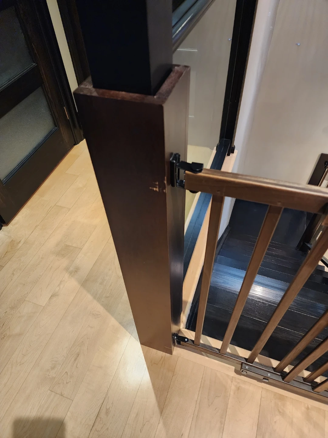 Evenflo Top-of-Stairs Gate, Natural Wood. 4 sets of gates. Bought from canadian tire and then custom installed. Total project cost was over $2000. Customer shrouded built for wood posts so posts would no be damaged with wood Gate instalation. This sale includes 4 gates that are up to 48" wide. 6 post shrouded and 2 wall mounts. So you get 2 top of stairs gates and mounts and two bottom of the stairs gates and mounts. The gates themselves, you can buy brand new from canadian tire for a $130 + plus tax. Or take all 4 from me and the post protectors. And wall mounts for $400.