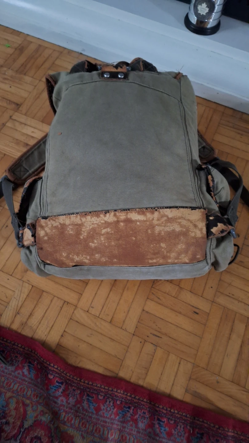 This is a well-worn canvas backpack with some vintage charm. It has a unique look with visible wear and tear on the straps and edges. Perfect for someone who appreciates a rustic, lived-in style!