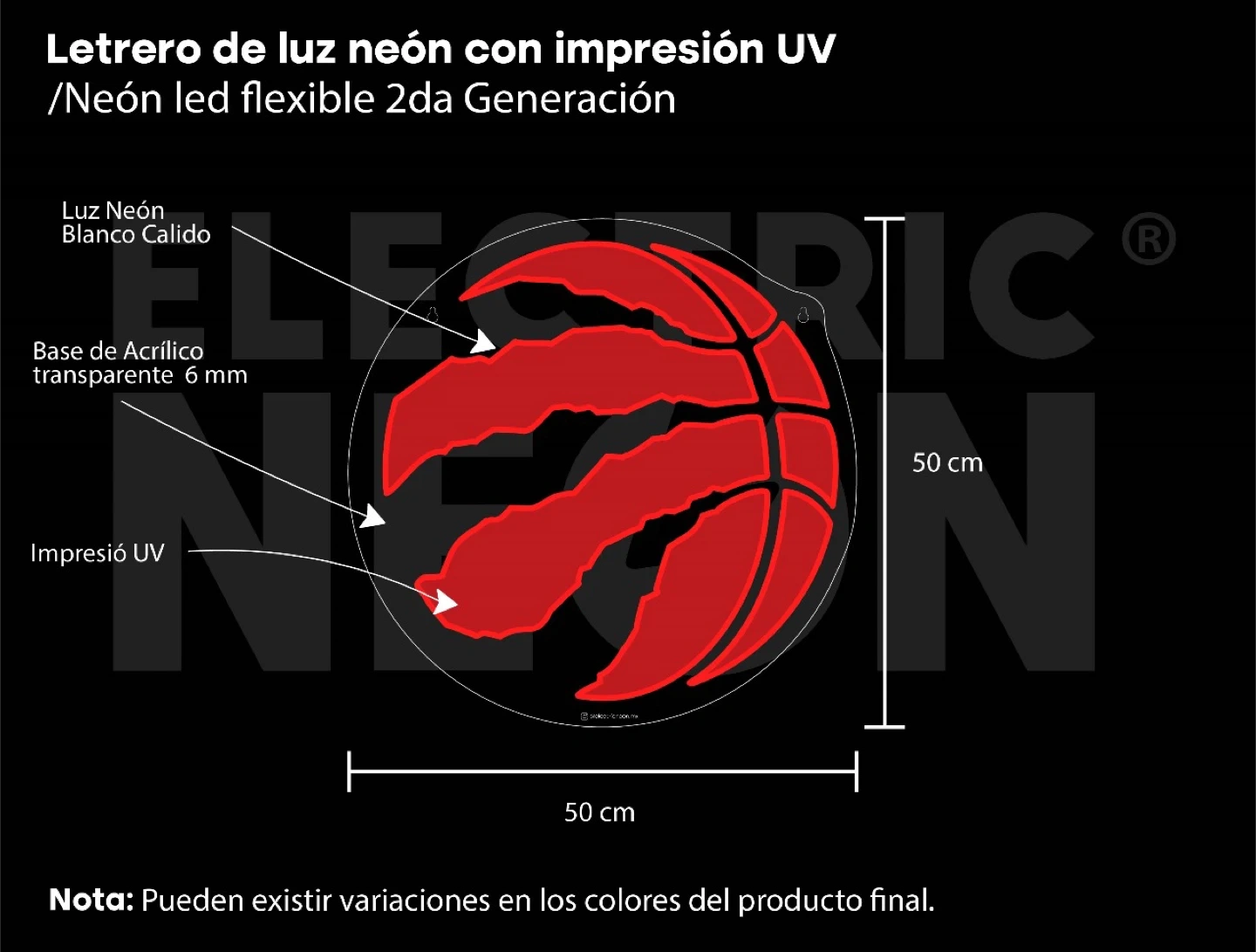 Brighten up your space with this LED Neon sign featuring the Toronto Raptors logo! It's a flexible 2nd generation neon LED with a warm white light. The sign is 50cm in diameter and has a 6mm transparent acrylic base. It also has UV printing for a vibrant look