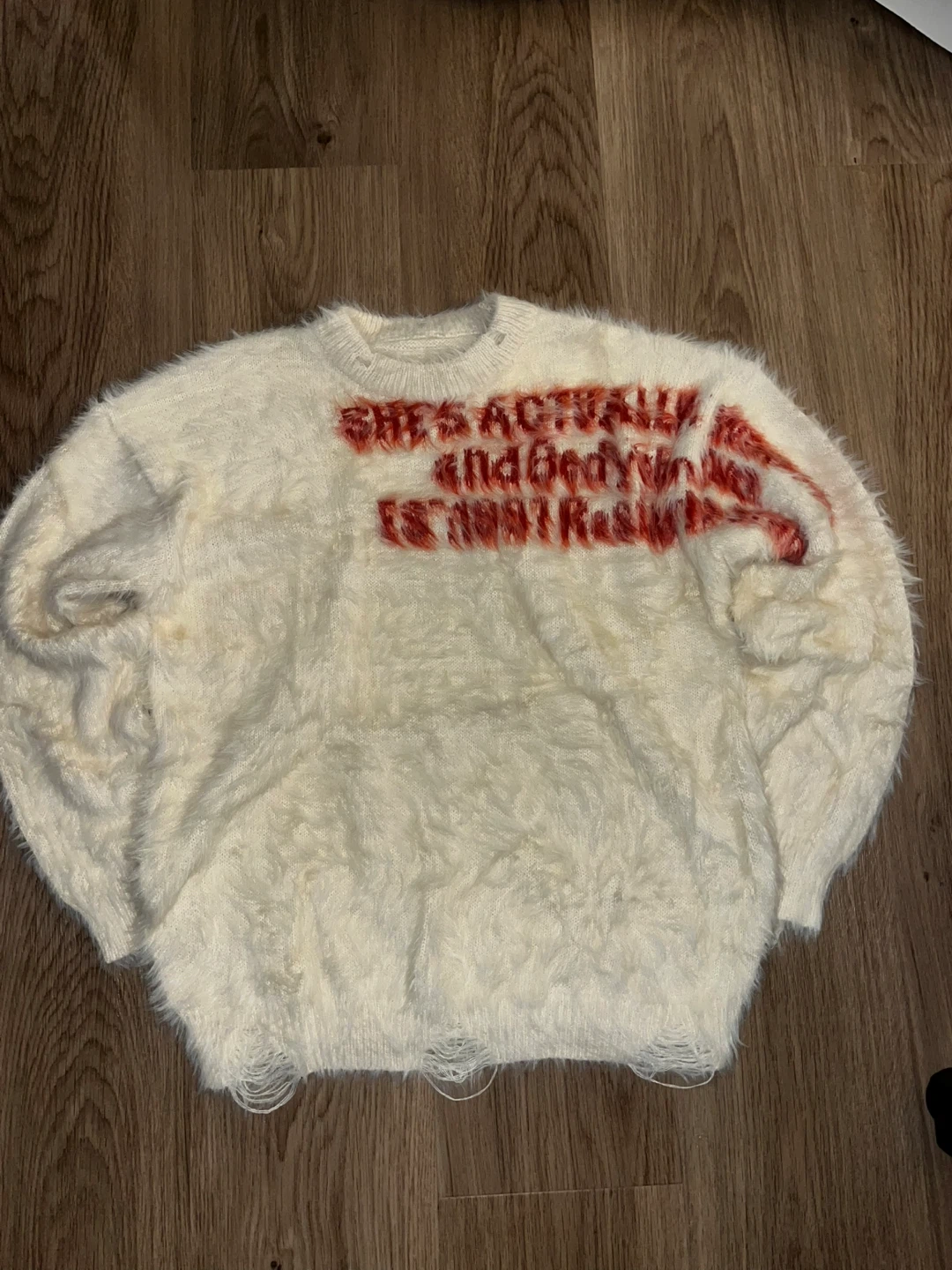 Selling a cozy, white fuzzy knit sweater. It features a unique design with the text in red. The sweater has a soft, textured feel, perfect for staying warm and stylish during cooler weather and wore it one time