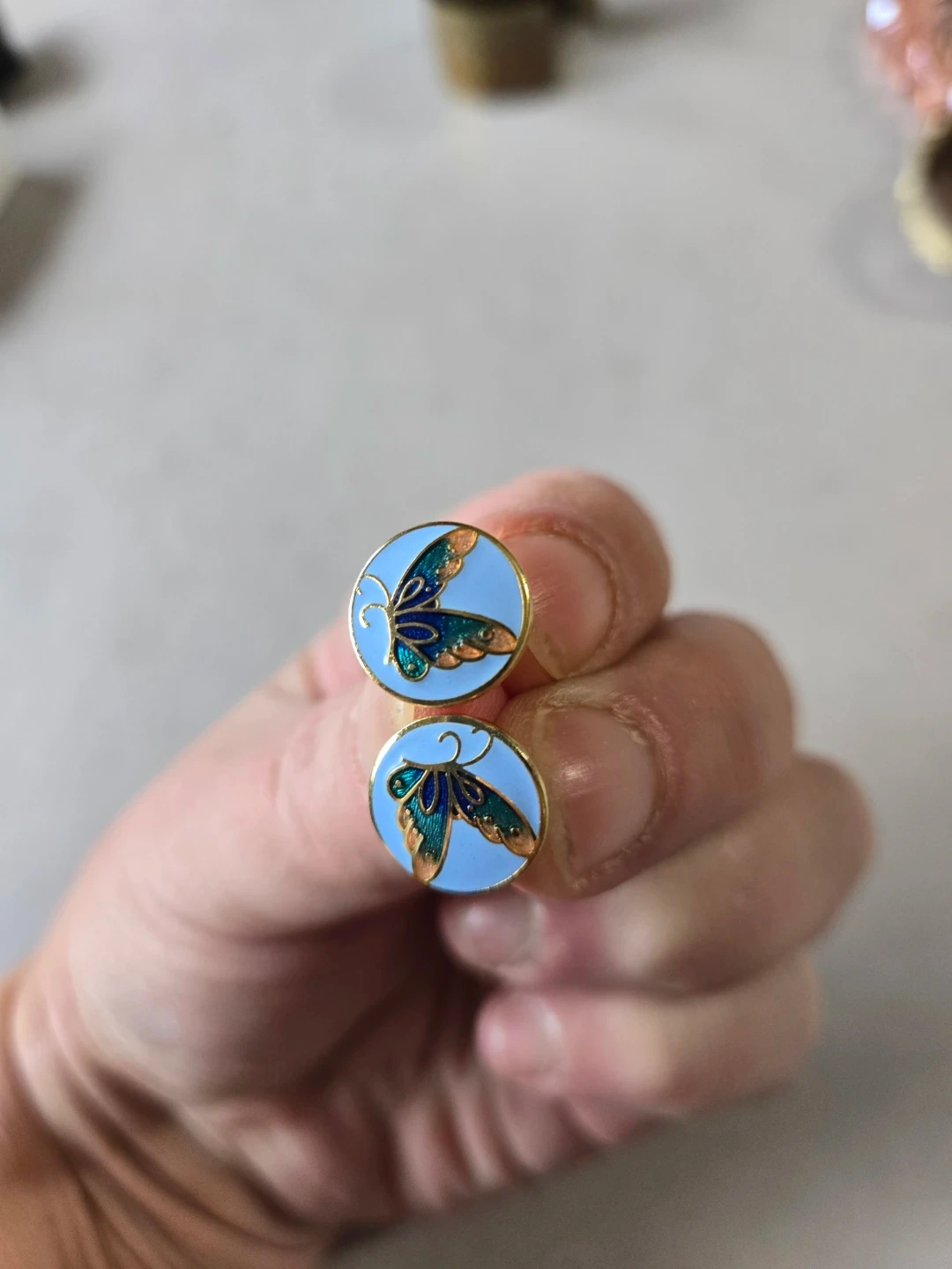 These are a pair of cute enamel stud earrings featuring a butterfly design! The earrings have a light blue background with a butterfly in shades of blue and green with gold accents. Perfect for adding a touch of whimsy to any outfit