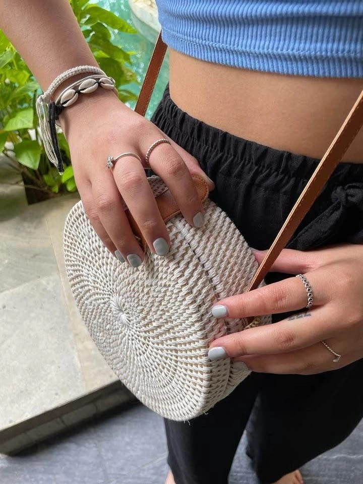These rattan round bags are handmade in Bali, Indonesia, using natural rattan fiber with a handwoven knit.