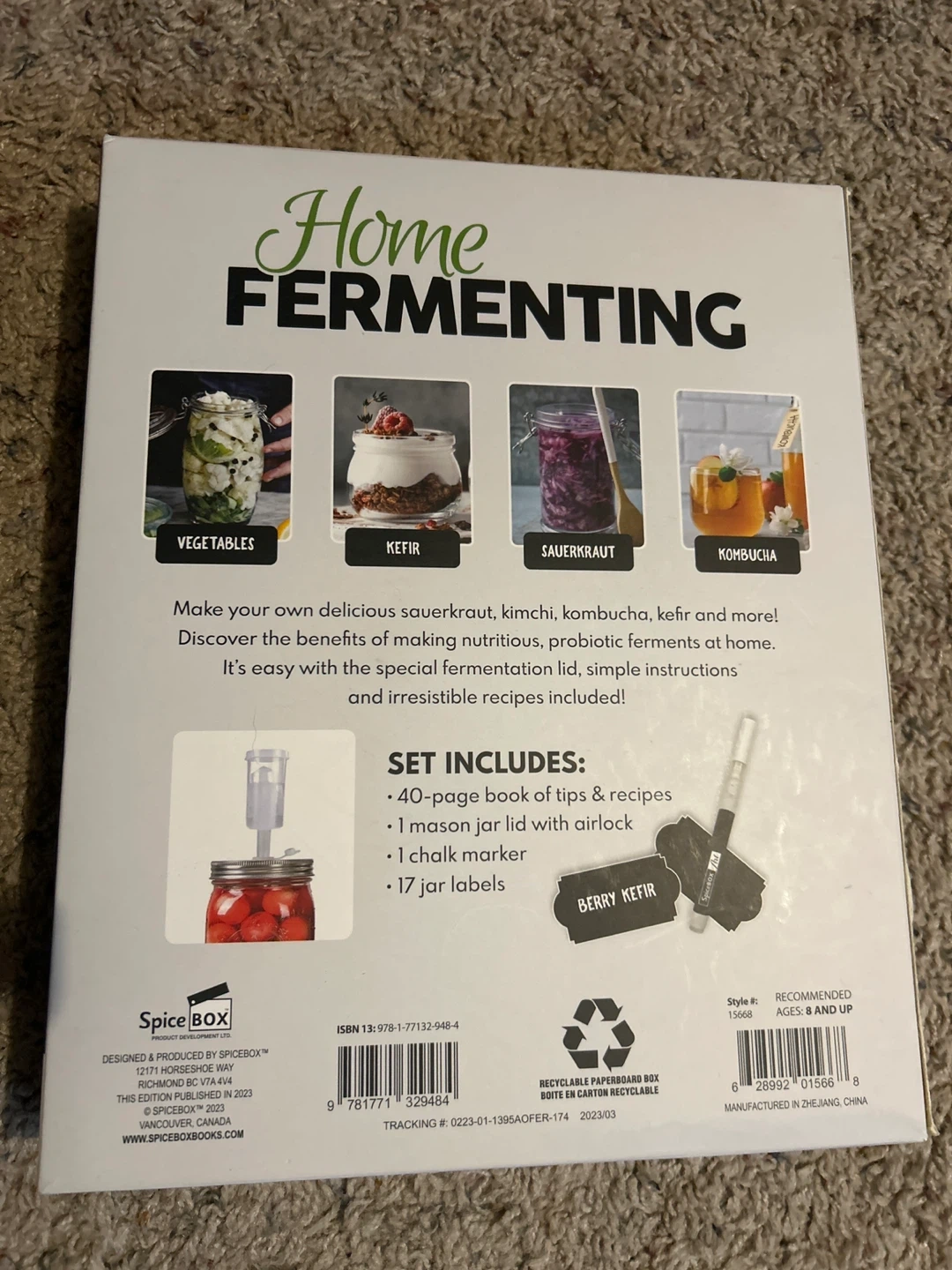 New and includes everything you need to make your own kimchi, sauerkraut, kombucha, and more. The set includes a 40-page book of tips and recipes, a mason jar lid with airlock, a chalk marker, and 17 jar labels. Recommended for ages 8 and up