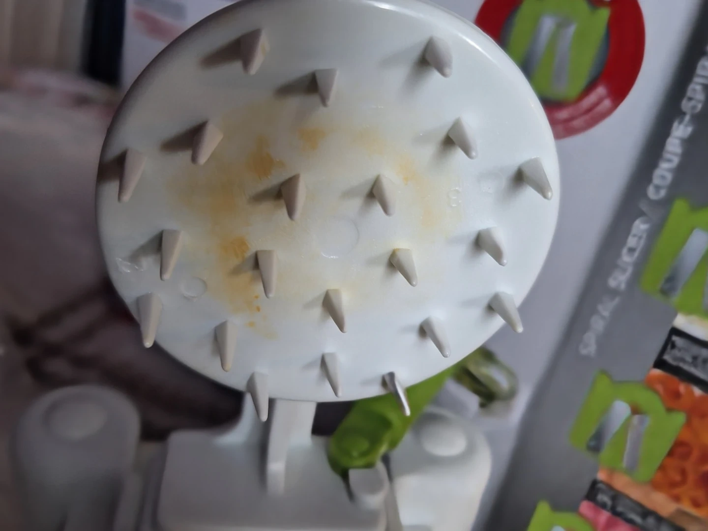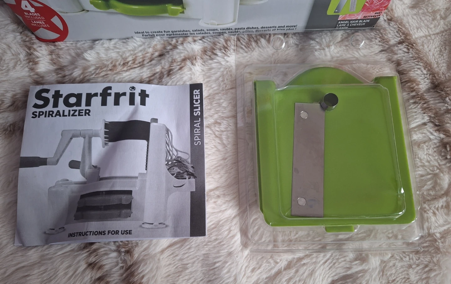 Includes original box, instructions, and all 4 blades in great condition. There is some discoloration on the vegtable grip due to me using carrots (see picture 4), but it is in great condition!