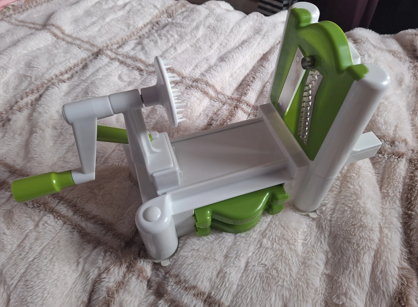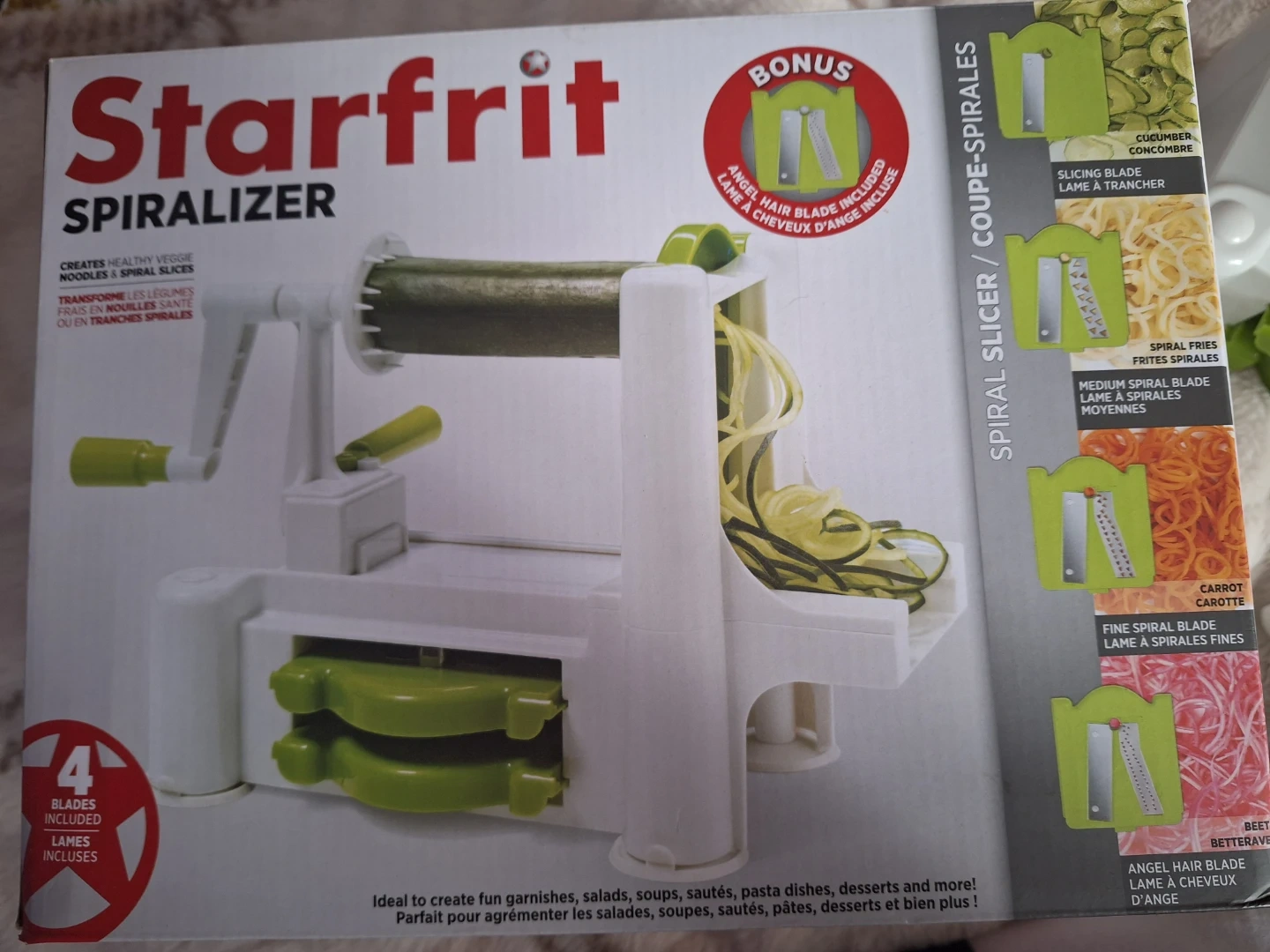 I'm selling a Starfrit Spiralizer, perfect for making healthy veggie noodles and spiral slices! It comes with 4 blades for different cuts, and suction cup legs to keep in place while cutting. Ideal for fun garnishes, salads, soups, and more!