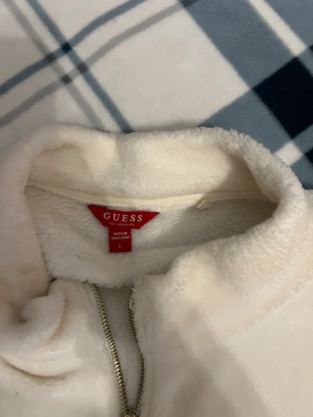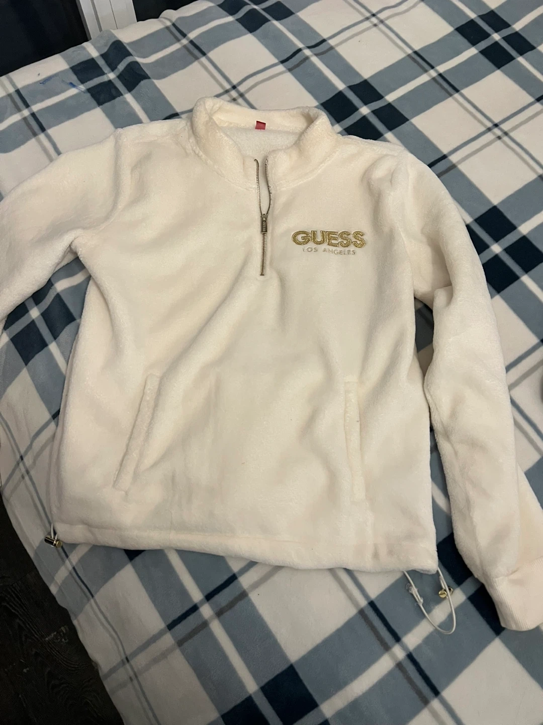 Selling a cozy Guess Los Angeles fleece pullover in size large! It's a cream/off-white colour and features a quarter-zip design and two front pockets. Perfect for staying warm and stylish