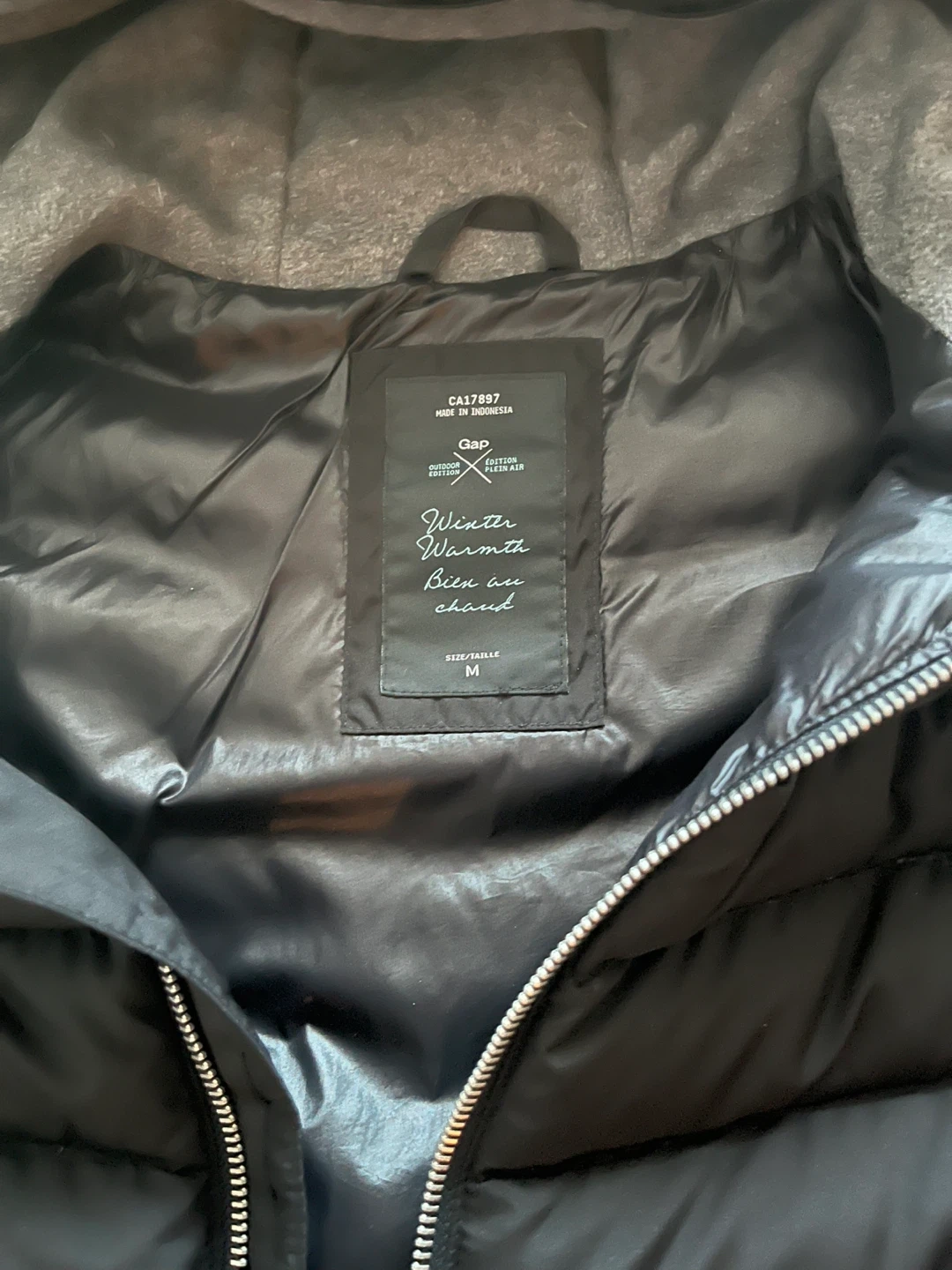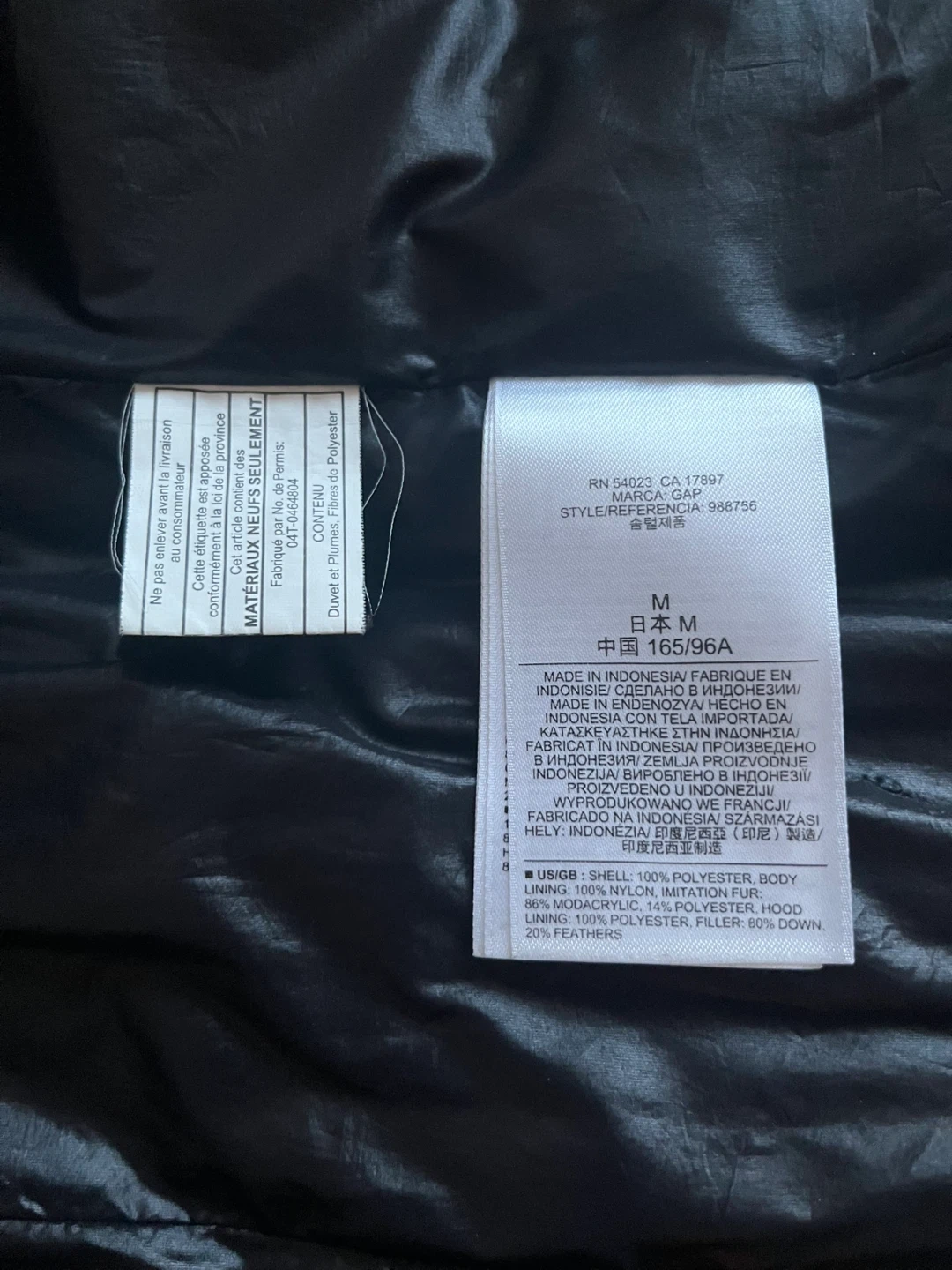 Selling a black cozy, warm puffer vest from the GAP with removable fur. Also available in a vibrant red color.