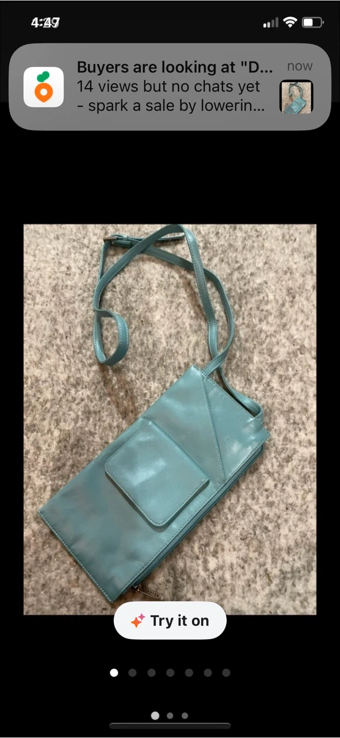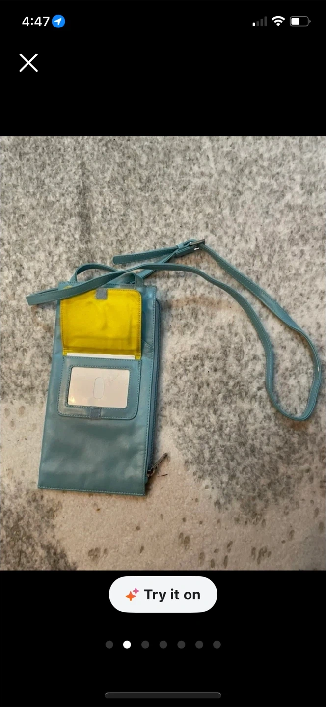 Here's a cute Danier crossbody bag in a lovely shade of blue! It features a bright yellow interior lining, adding a pop of colour. Perfect for carrying your essentials while keeping your hands free