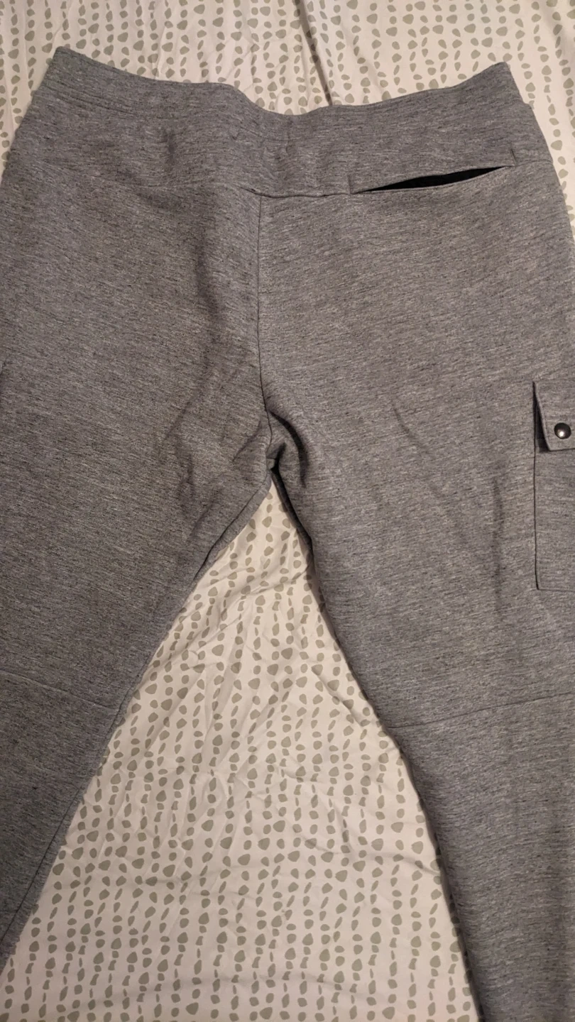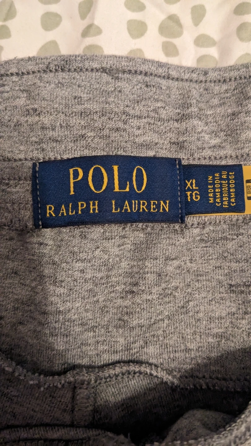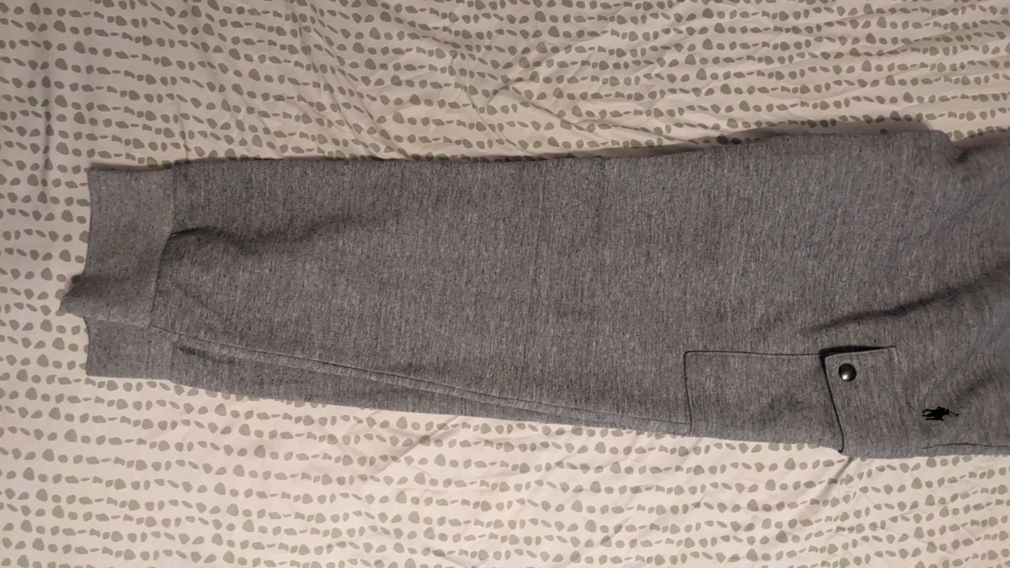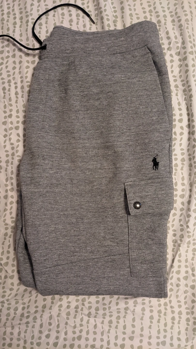 Selling a pair of Polo Ralph Lauren cargo sweatpants in size XL. They're a comfy grey colour and have a handy cargo pocket detail on the side. Great for lounging or running errands!
