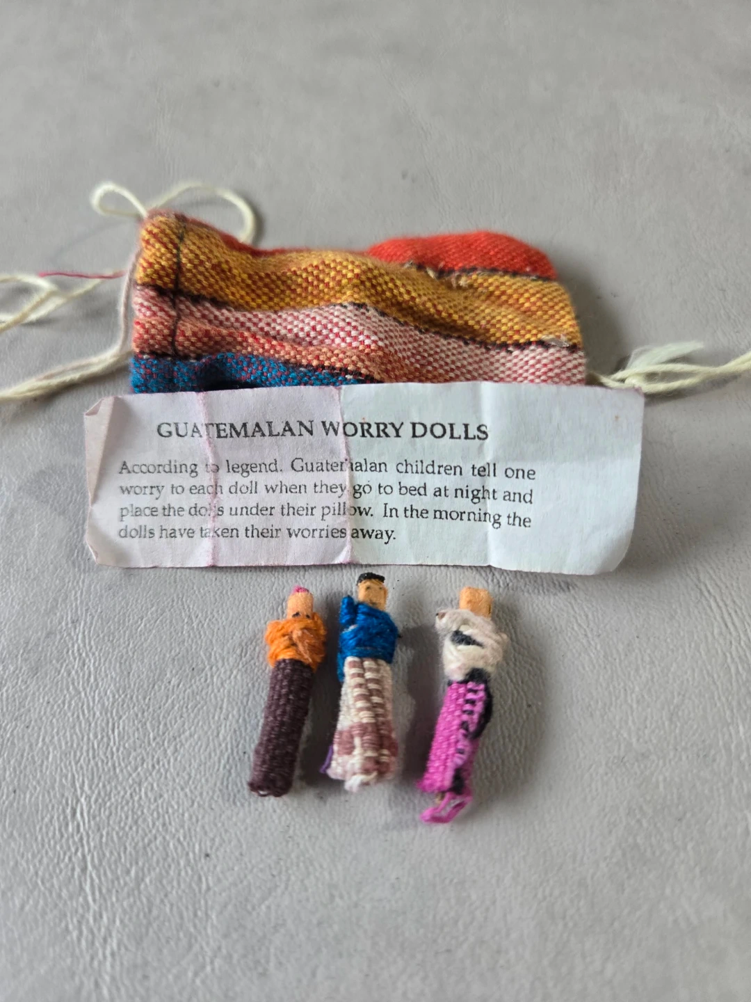 Here's a set of Guatemalan worry dolls, complete with their little pouch! According to legend, Guatemalan children tell one worry to each doll when they go to bed at night and place the dolls under their pillow. In the morning, the dolls have taken their worries away