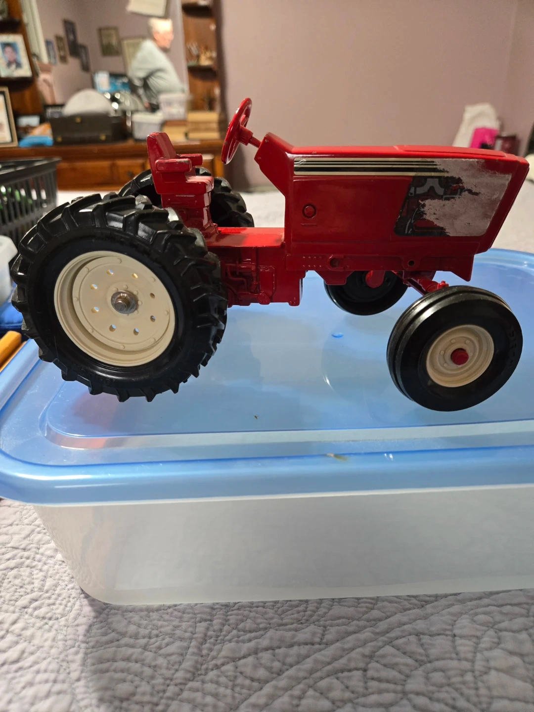 Selling a vintage International Harvester tractor toy. It's red and shows some signs of wear, as you can see in the photos. Perfect for a collector or anyone who loves vintage toys!