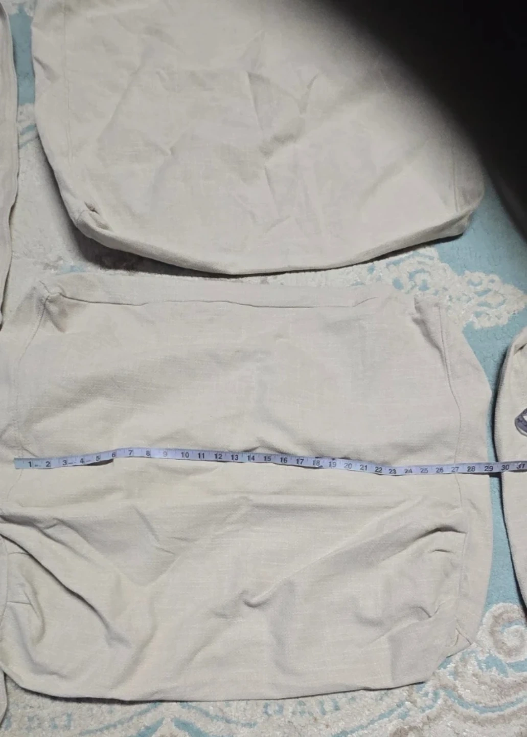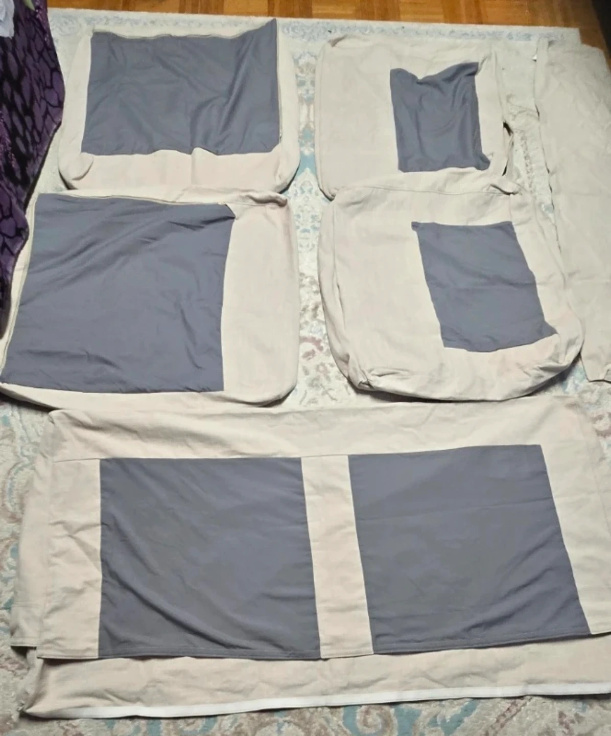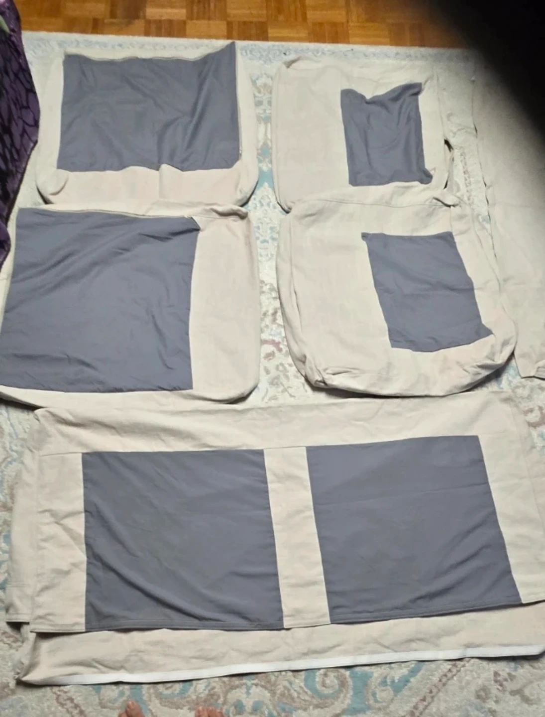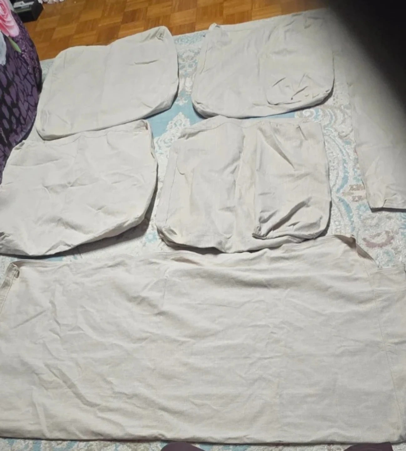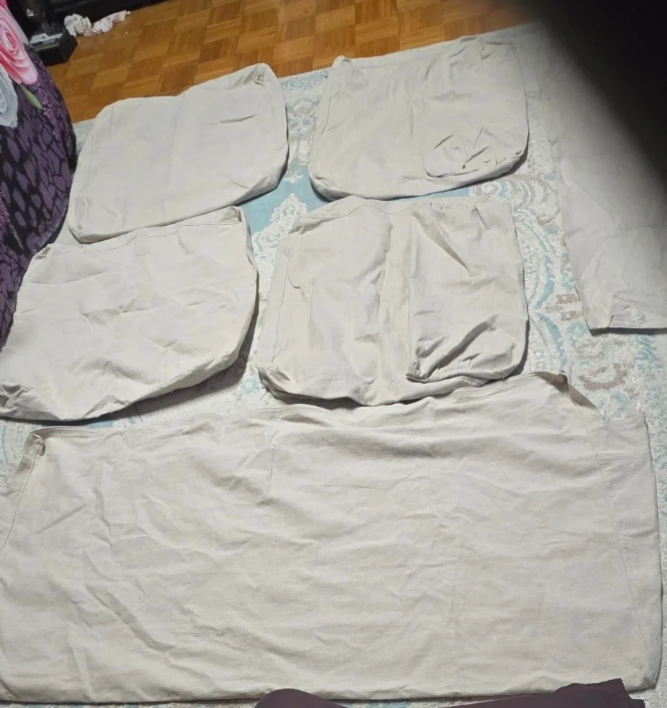 Selling a set of beige couch cushion covers. The set includes covers for the back cushions, seat cushions, and the base of the couch. The base cover measures approximately 56 inches in length. They're NEW and ready to refresh your living space!