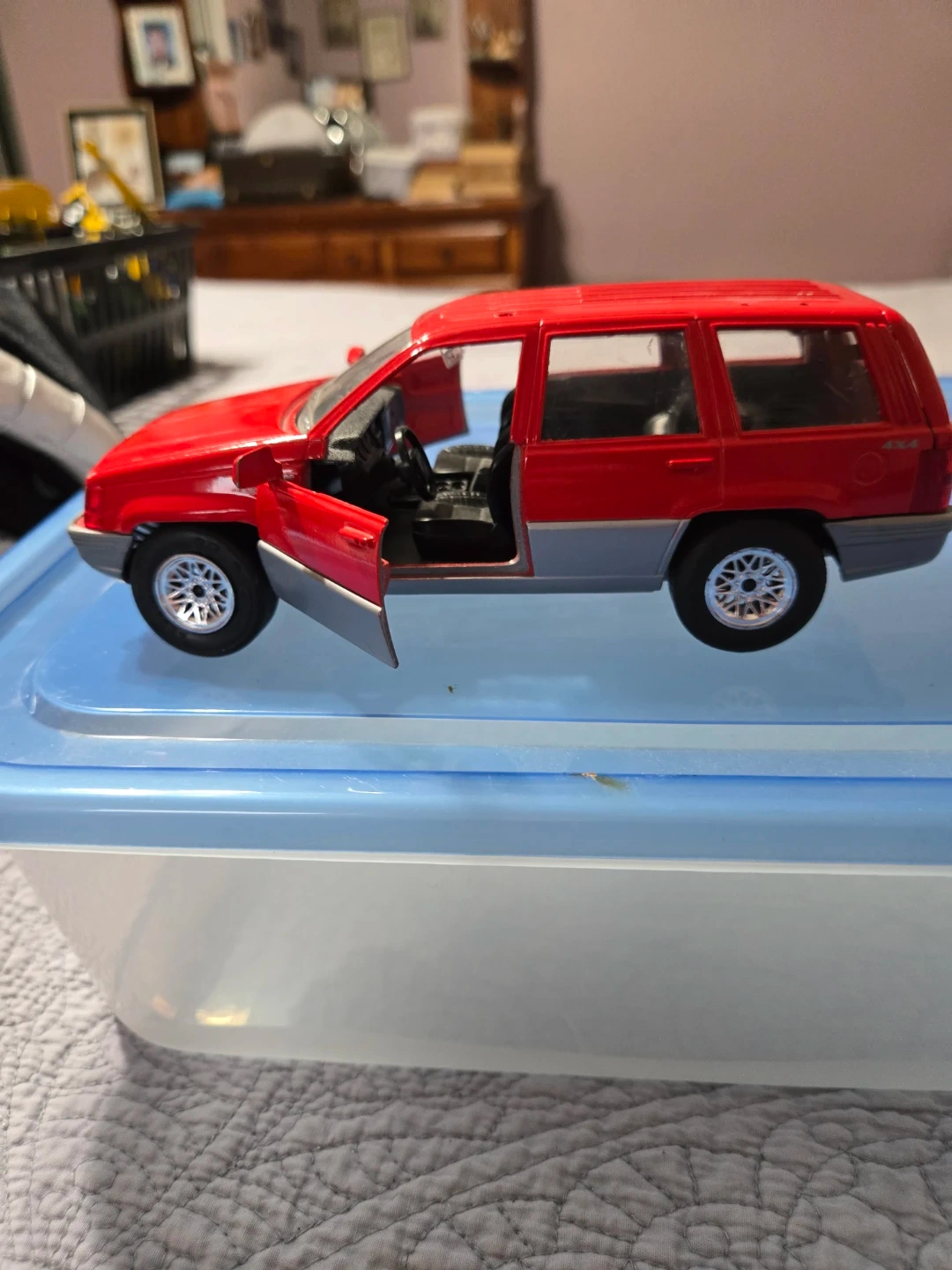 Selling a Majorette 1:18 Scale red diecast model of a Jeep Grand Cherokee 4x4. It's in good condition and would be a great addition to any car collection