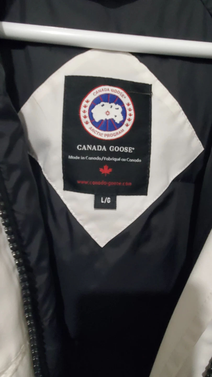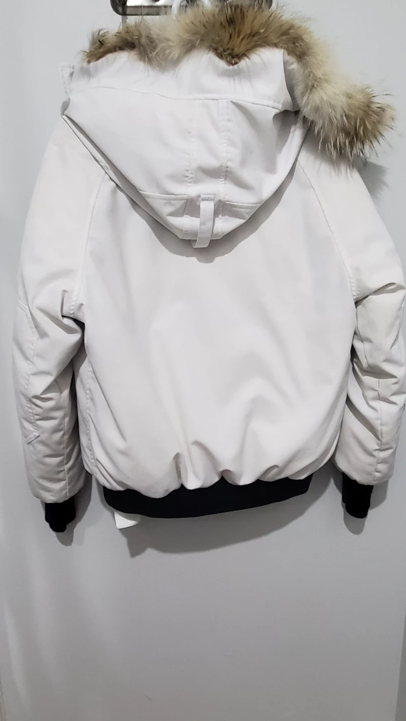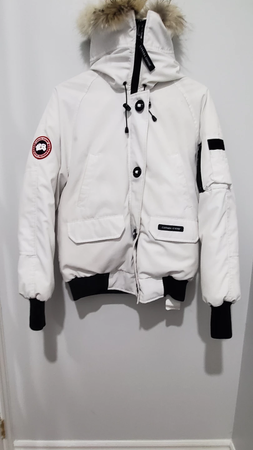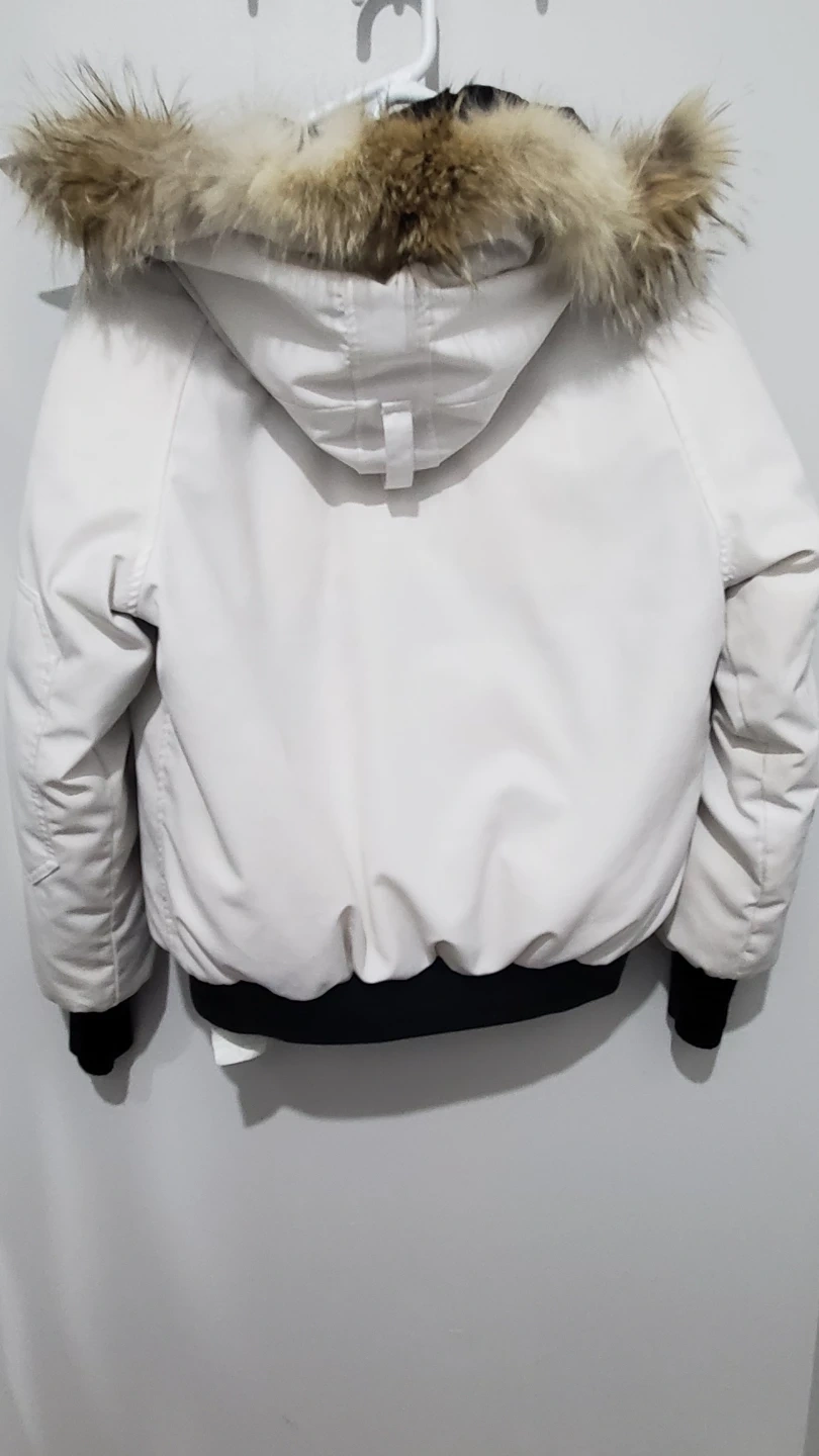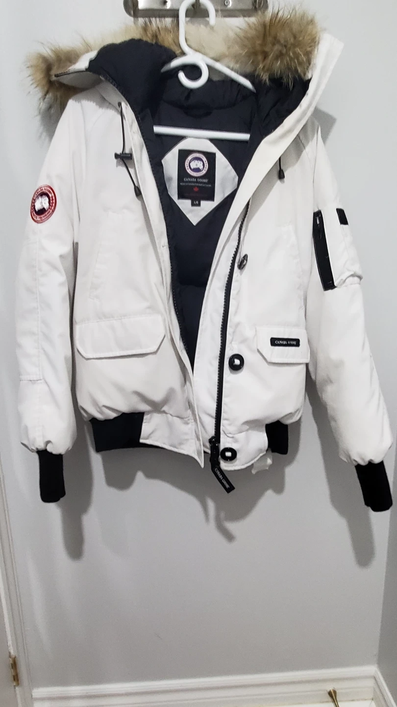 Selling a Canada Goose white down bomber jacket in size L. It's in great condition and ready for the colder weather! Features the classic Canada Goose Arctic Program patch on the arm, and a fur-trimmed hood to keep you cozy.