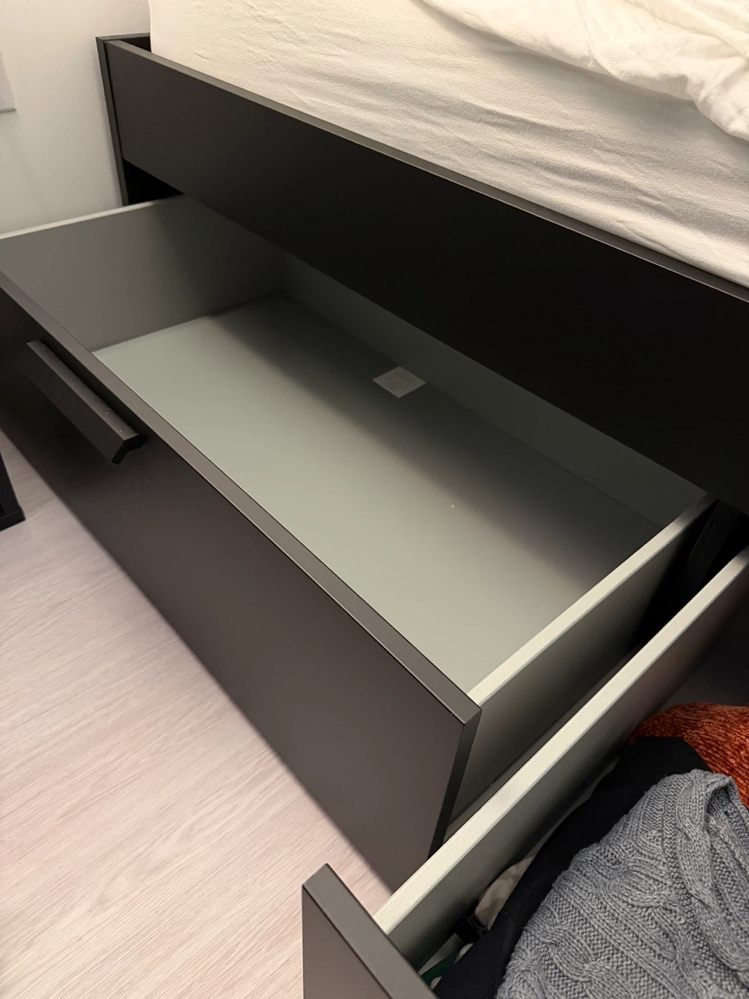 Selling a black IKEA Brimnes full-size bed frame with built-in storage drawers.
