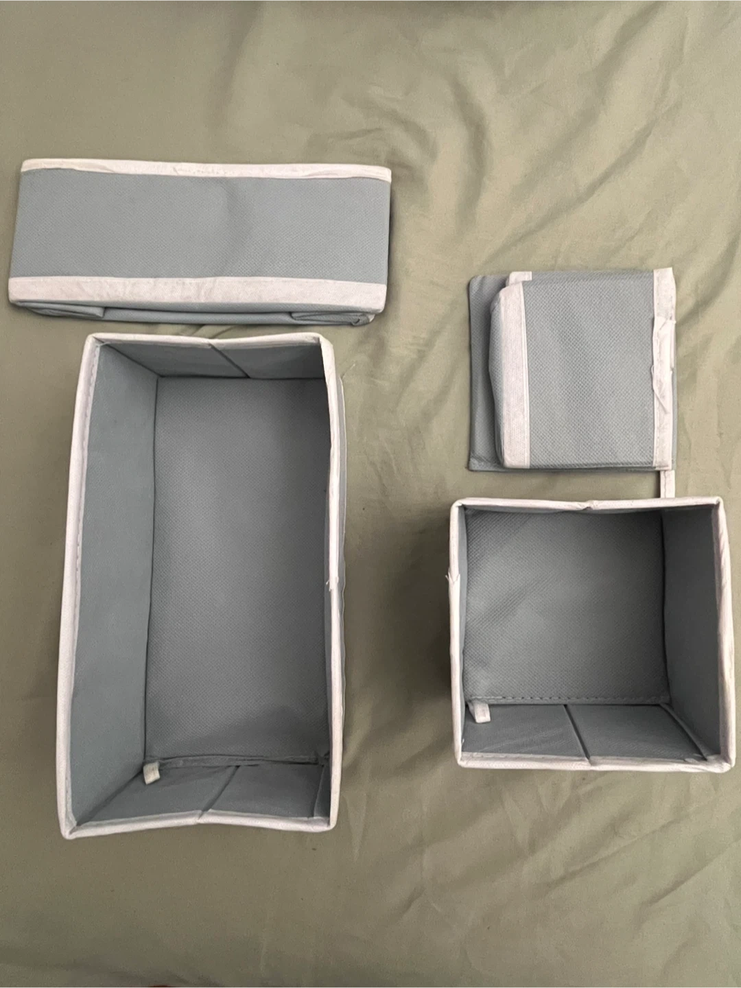 Here's a set of four fabric storage bins, perfect for organizing drawers or shelves! They come in various sizes to fit your needs.