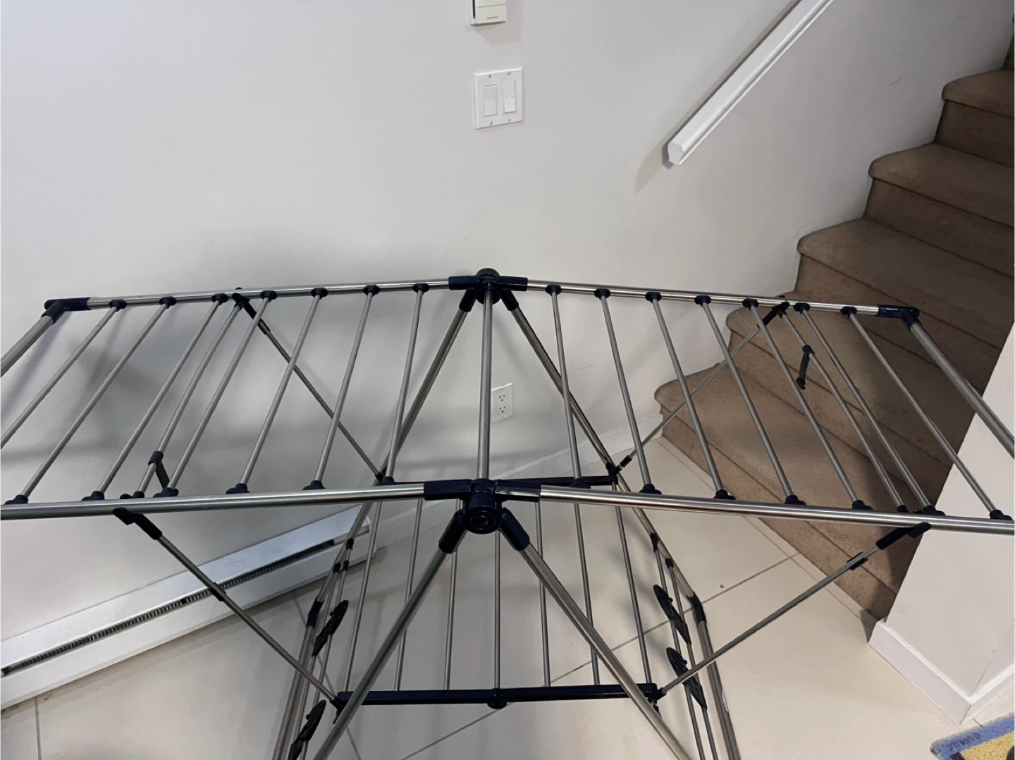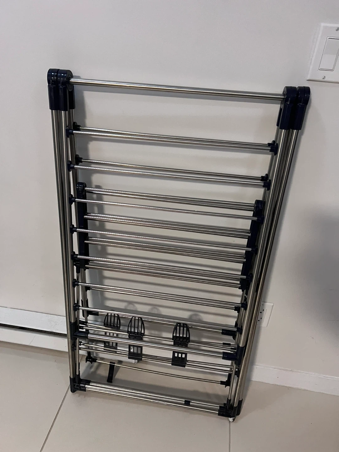This is a handy folding clothes drying rack, perfect for apartments or smaller spaces where you don't have a lot of room for drying clothes. It's in great condition and ready to use right away!