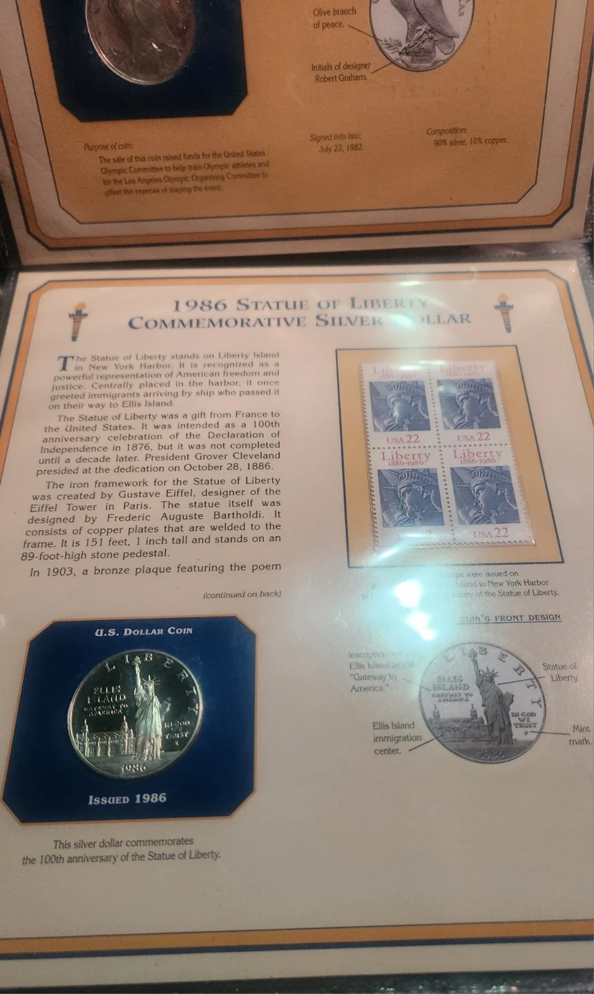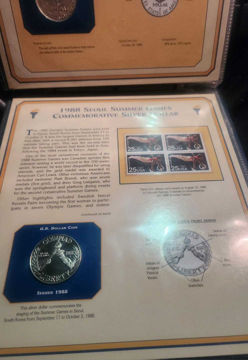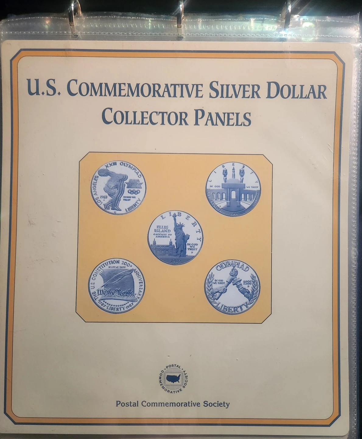 U.S. Commemorative Silver Dollar Collector Panels featuring coins and stamps commemorating the 1984 Los Angeles Summer Games, 1983 Los Angeles Summer Games, and the 1986 Statue of Liberty