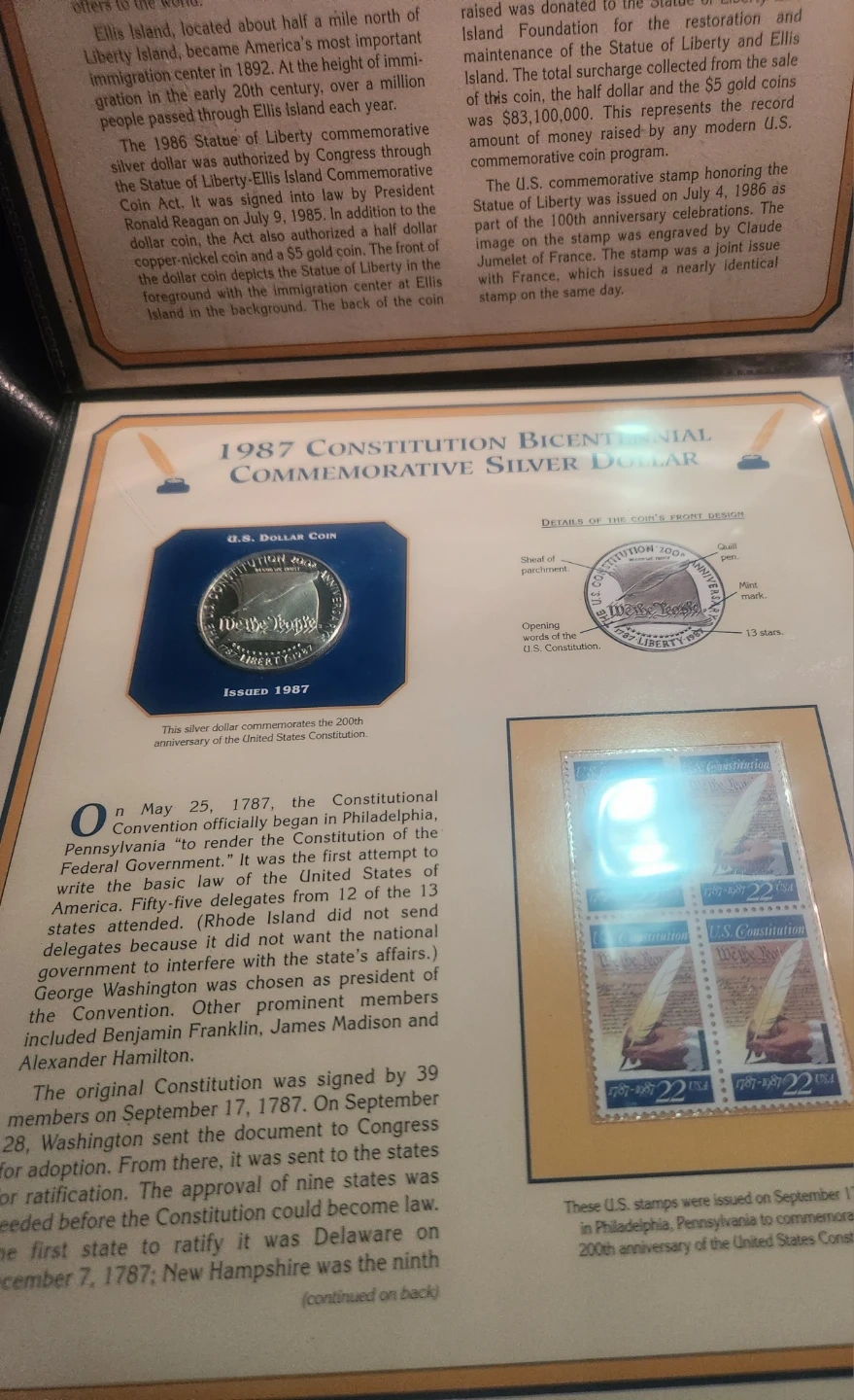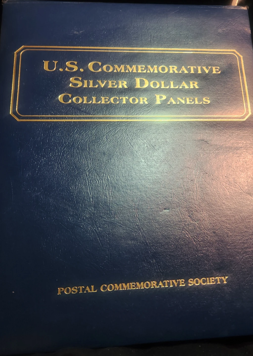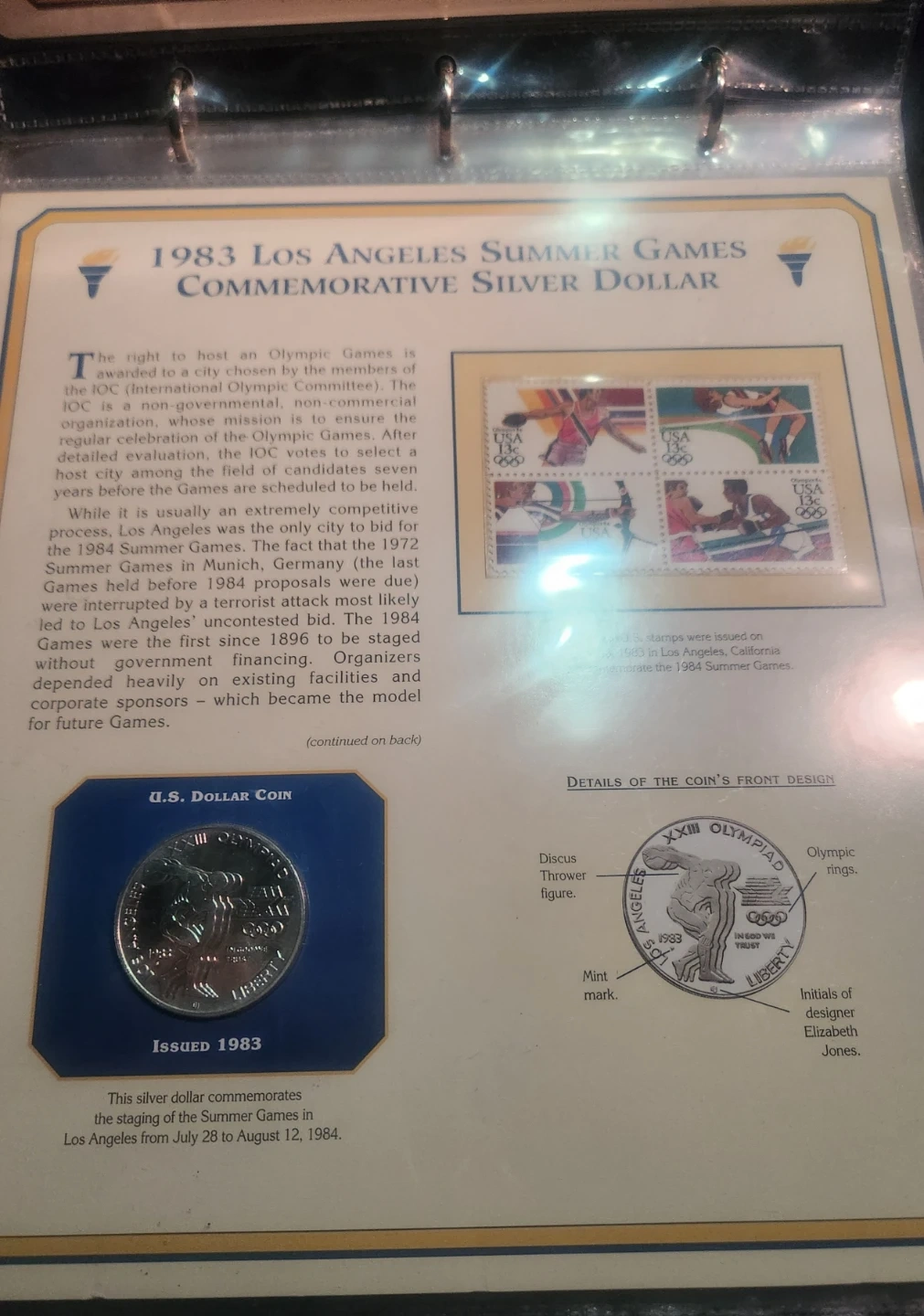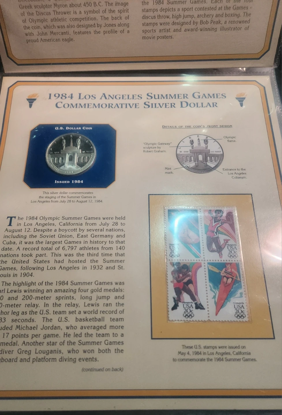 U.S. Commemorative Silver Dollar Collector Panels featuring coins and stamps commemorating the 1984 Los Angeles Summer Games, 1983 Los Angeles Summer Games, and the 1986 Statue of Liberty