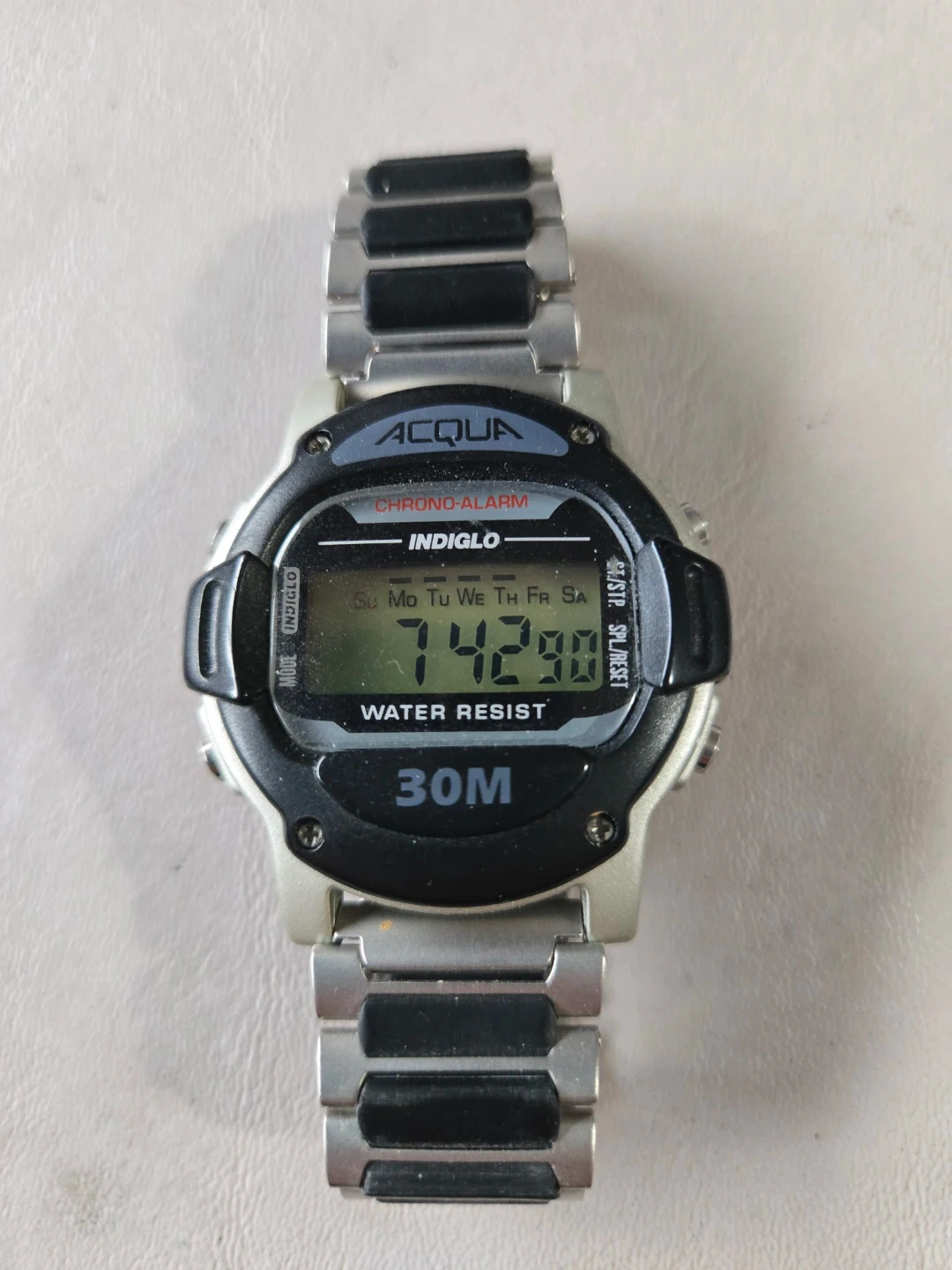 Selling an Acqua Chrono-Alarm Indiglo watch! It's water resistant to 30M. The digital display is clear and easy to read. Great for everyday wear!