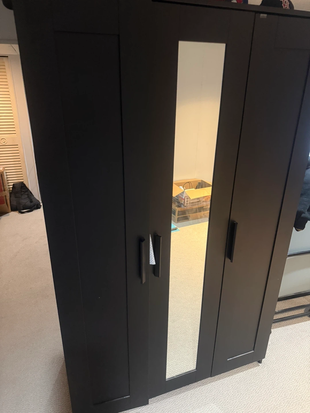Selling a black wardrobe with a mirror. It's in great condition and ready for a new home! It features a sleek design that will complement any bedroom decor
