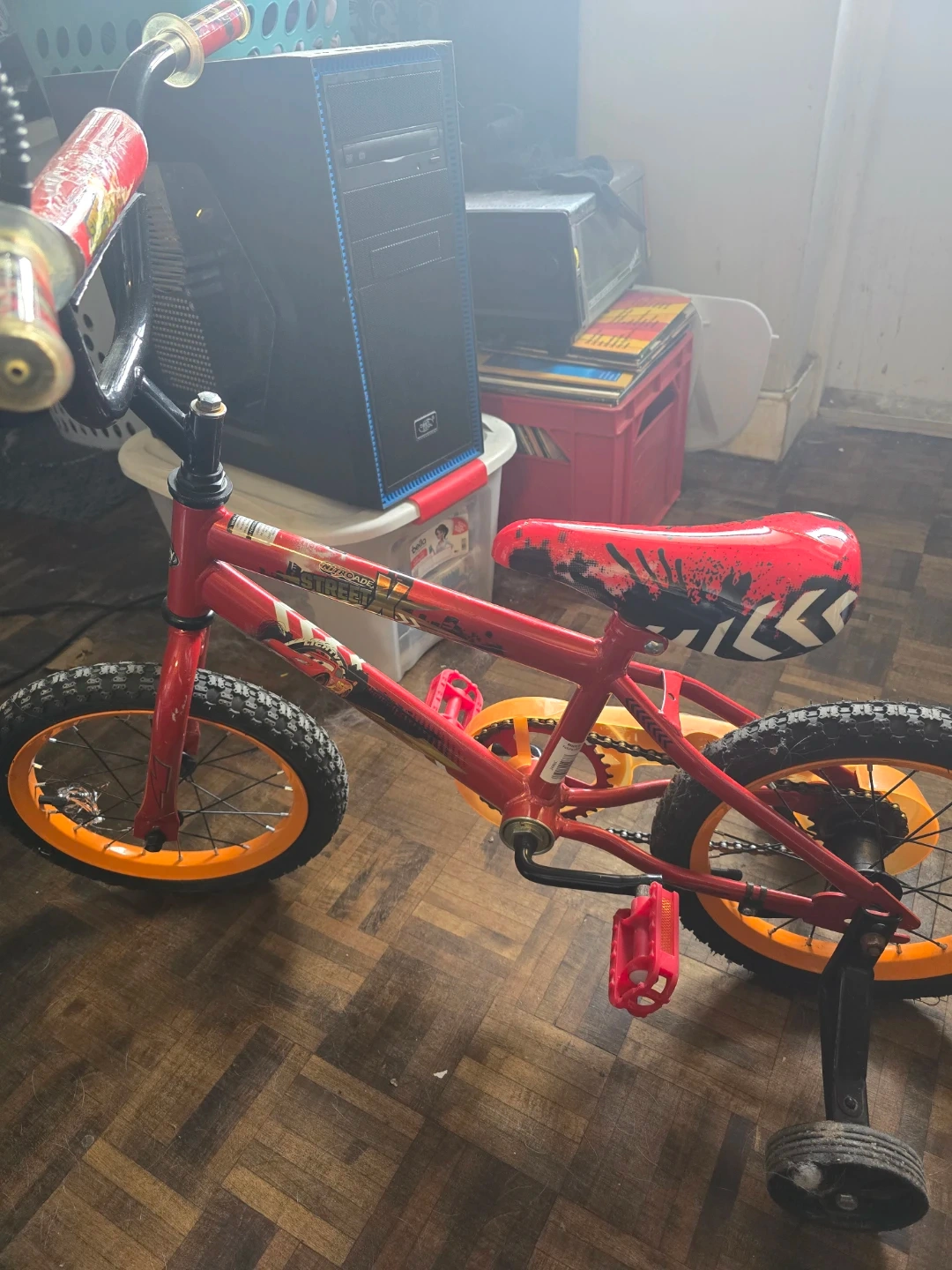 Selling a red BMX-style bike perfect for kids learning to ride! It comes with training wheels to help with balance and build confidence. The bike has a cool design with red and orange accents. Ready for a new rider to enjoy!