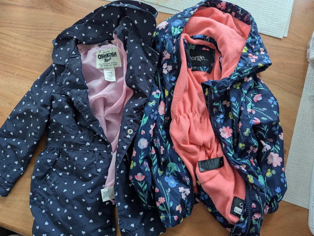 Two adorable jackets for your little one! One is an OshKosh B'gosh jacket in size 24M with a cute heart pattern. The other is a George jacket in size 2T with a floral print and a cozy fleece lining. Both are in great condition and ready for new adventures!