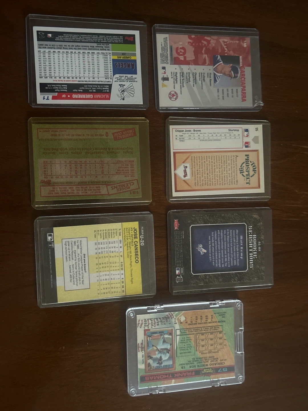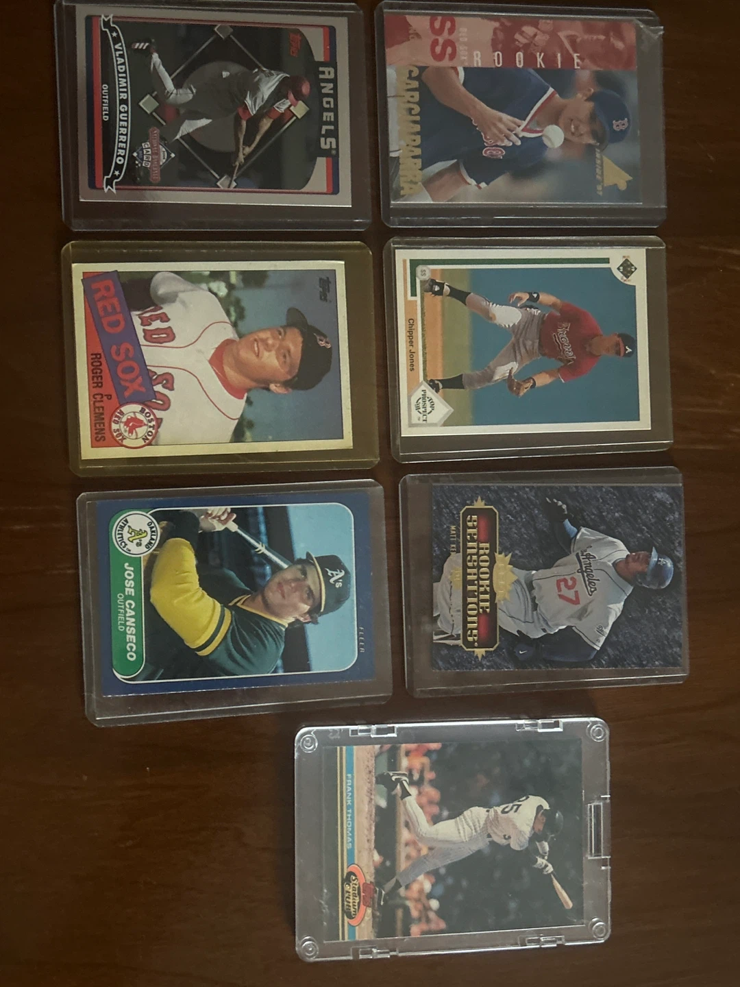 Selling a collection of baseball cards featuring players like Vladimir Guerrero, Chipper Jones, Roger Clemens, Jose Canseco, and Frank Thomas. Great for any sports card collector!