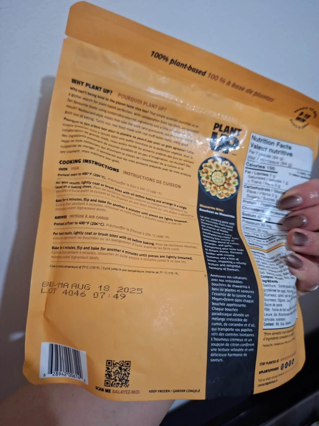 I have a bag of opened Clic Fava Beans, Plant Up Plant-Based Shawarma Bites and some leftover Ikea Huvudroll veggie balls. The Plant Up bites are 100% plant-based and expire August 18 2025.