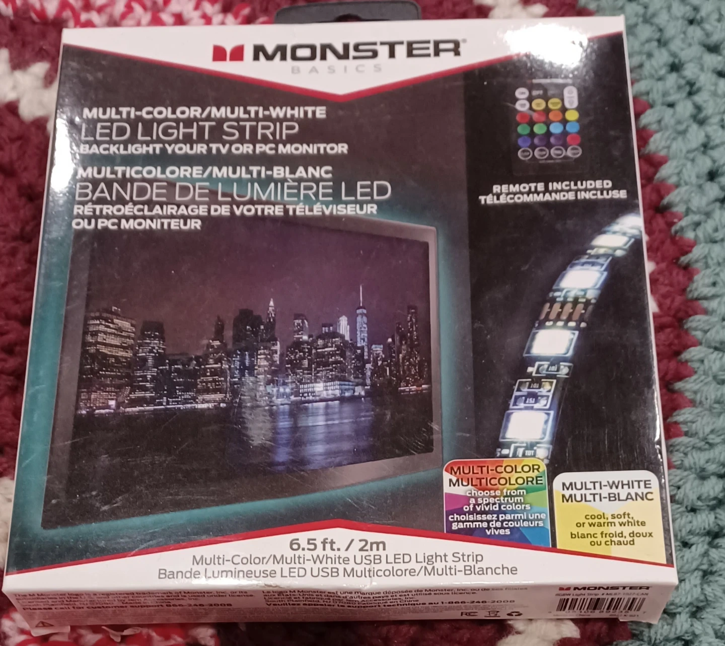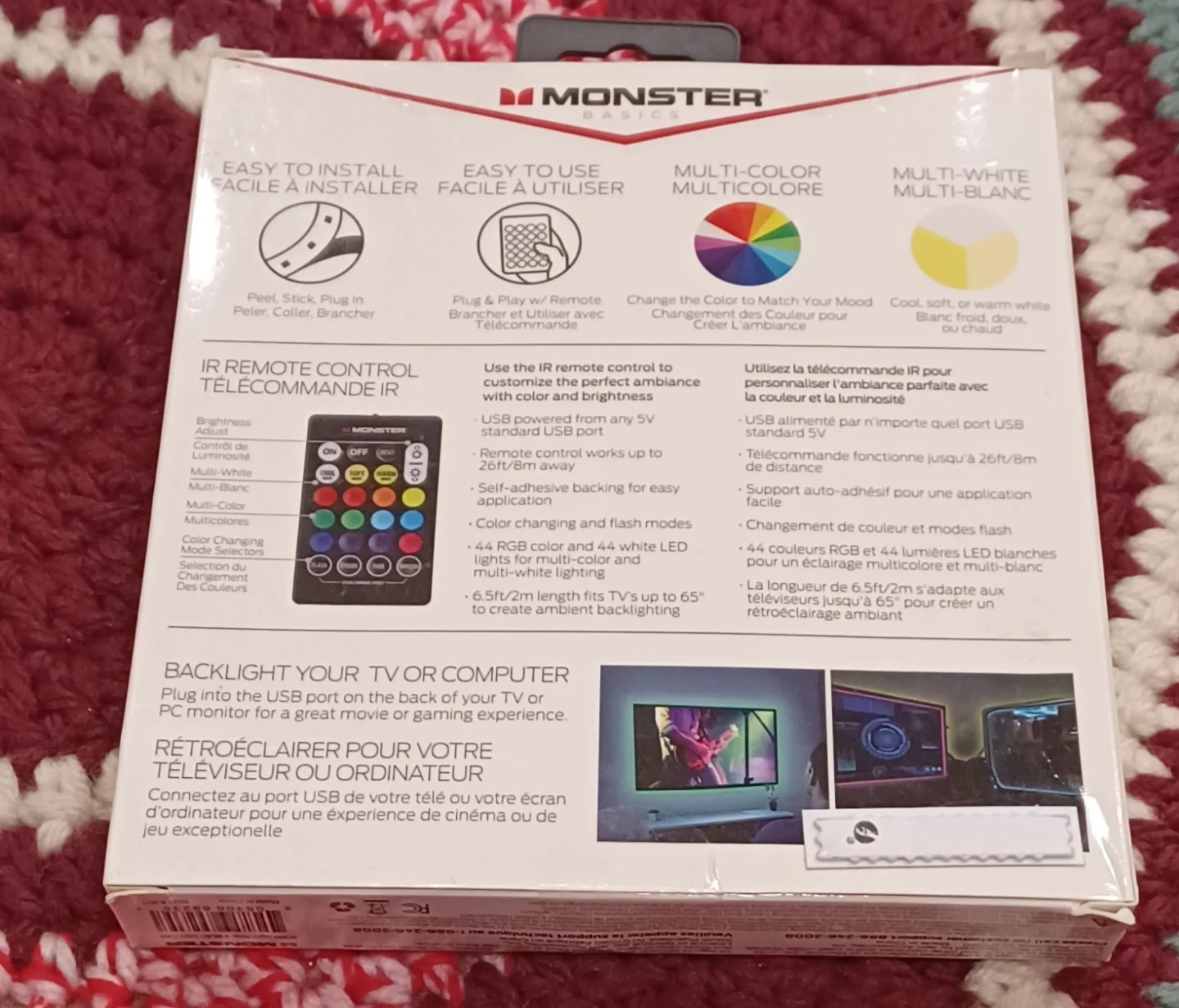 I'm selling a Monster Basics Multi-Color/Multi-White LED Light Strip for your TV or PC monitor. It comes with a remote. The strip is 6.5 ft/2m long. It's easy to install and use, just plug and play with the remote. You can use the IR remote to customize the perfect ambiance with color and brightness