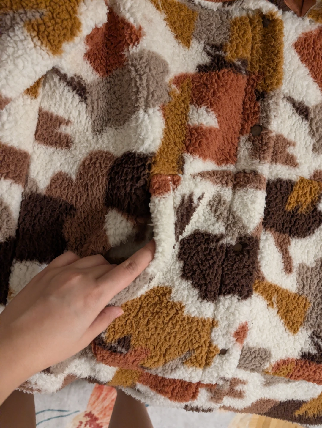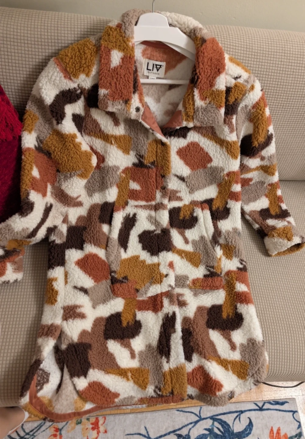 This LIV sherpa jacket features a unique brown pattern that's sure to stand out! It's super cozy and perfect for layering.