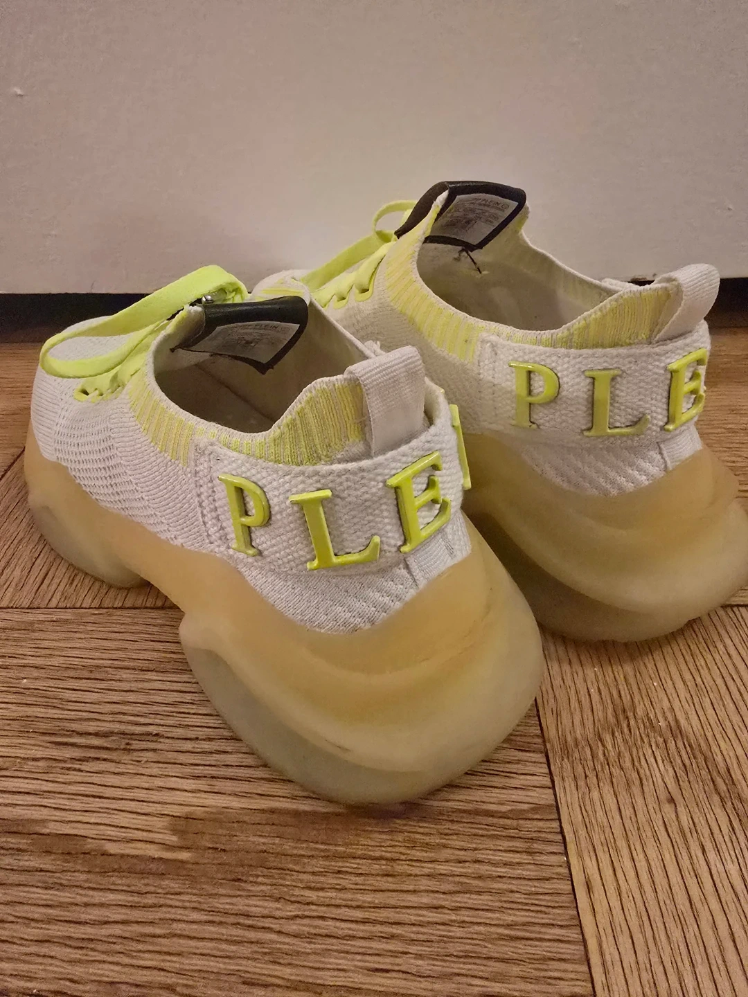 Selling a pair of Philipp Plein sneakers in white and yellow. They are a US size 6.5, which is a European size 38. These sneakers are in good condition and have the PLEIN logo on the back. Perfect for adding a pop of color to your wardrobe!