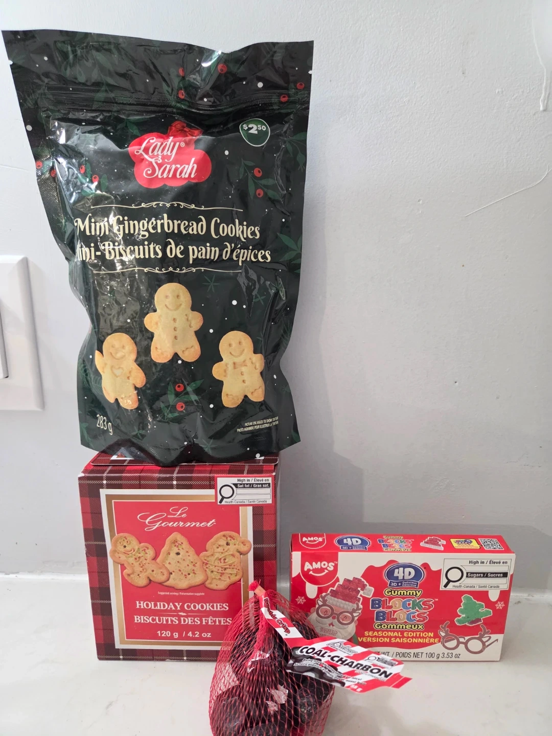 A mixture of Lady Sarah Mini Gingerbread Cookies, Le Gourmet Holiday Cookies, Amos 4D Gummy Blocks Seasonal Edition, and Coal Charbon candy.