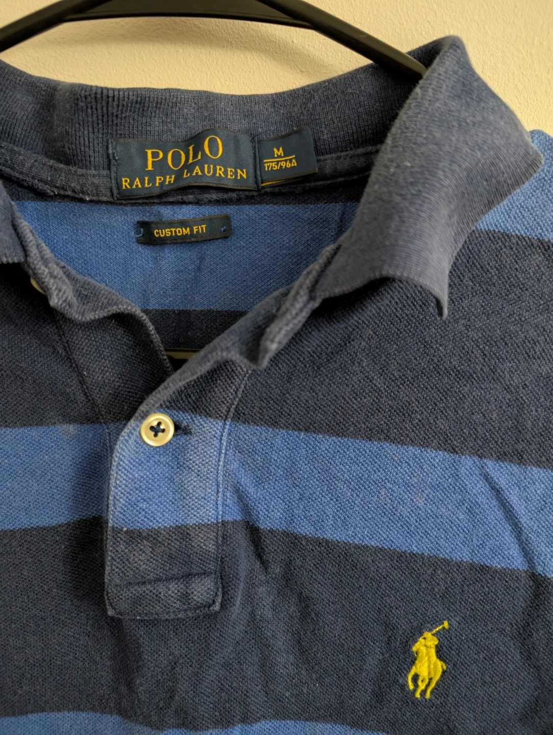 Selling a Polo Ralph Lauren polo shirt in a blue striped pattern. It's a custom fit and in good condition. Size is M.