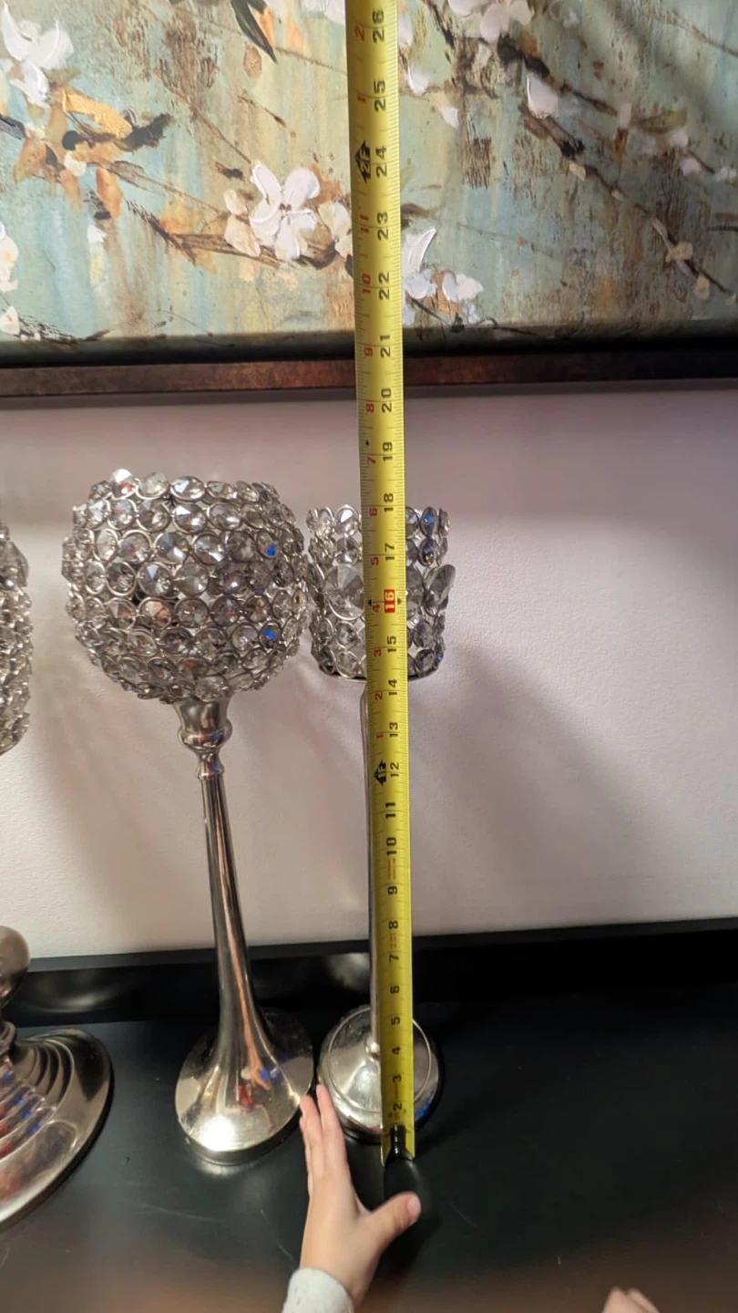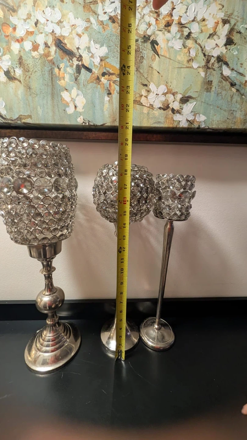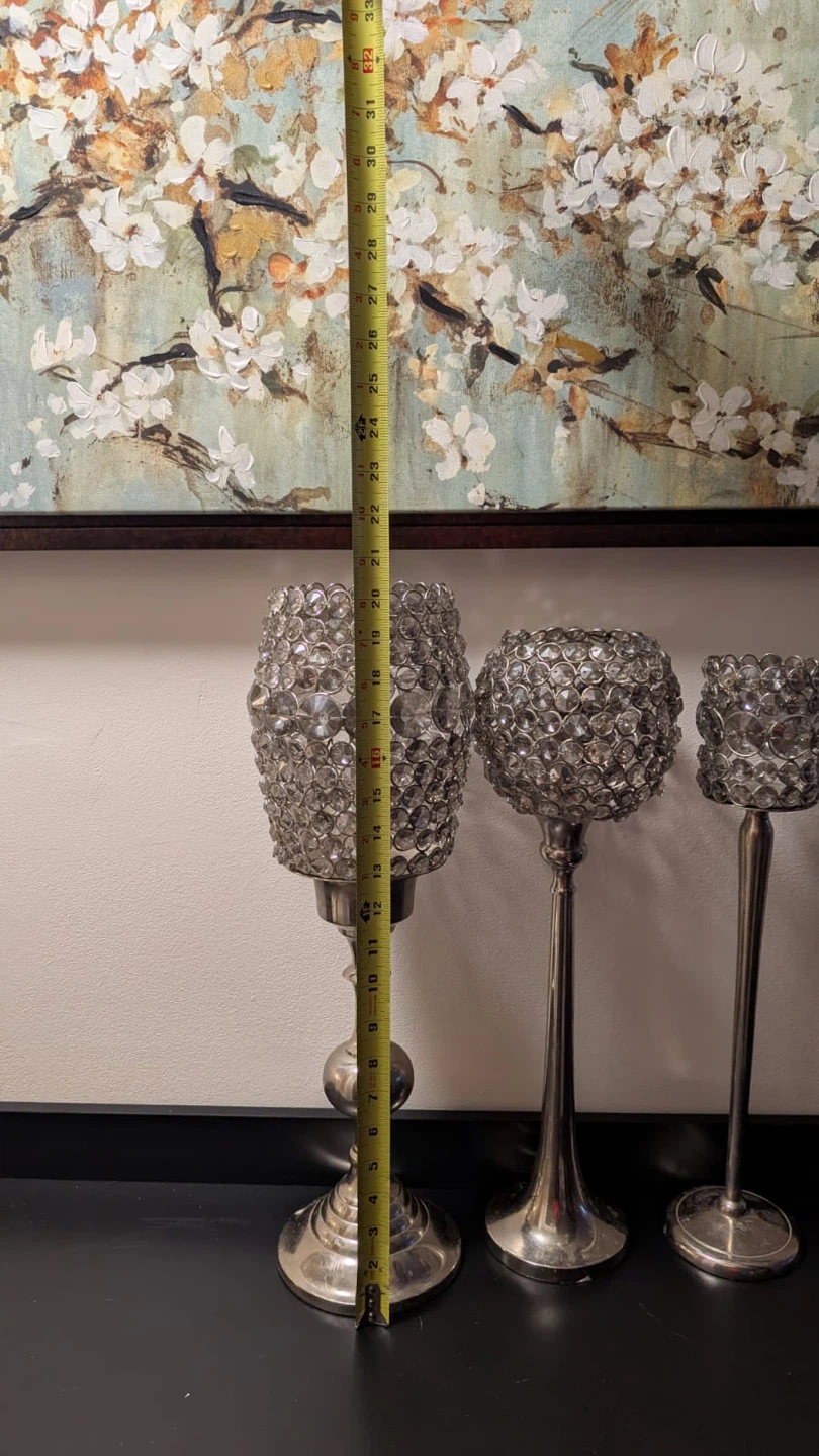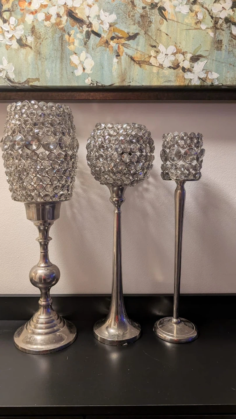 Selling a set of three silver beaded candle holders. The tallest one is about 26 inches tall, the middle one is about 21 inches, and the smallest one is about 16 inches. They would look great as a centrepiece or on a mantle!