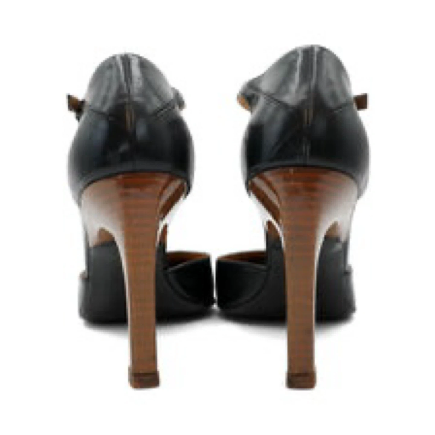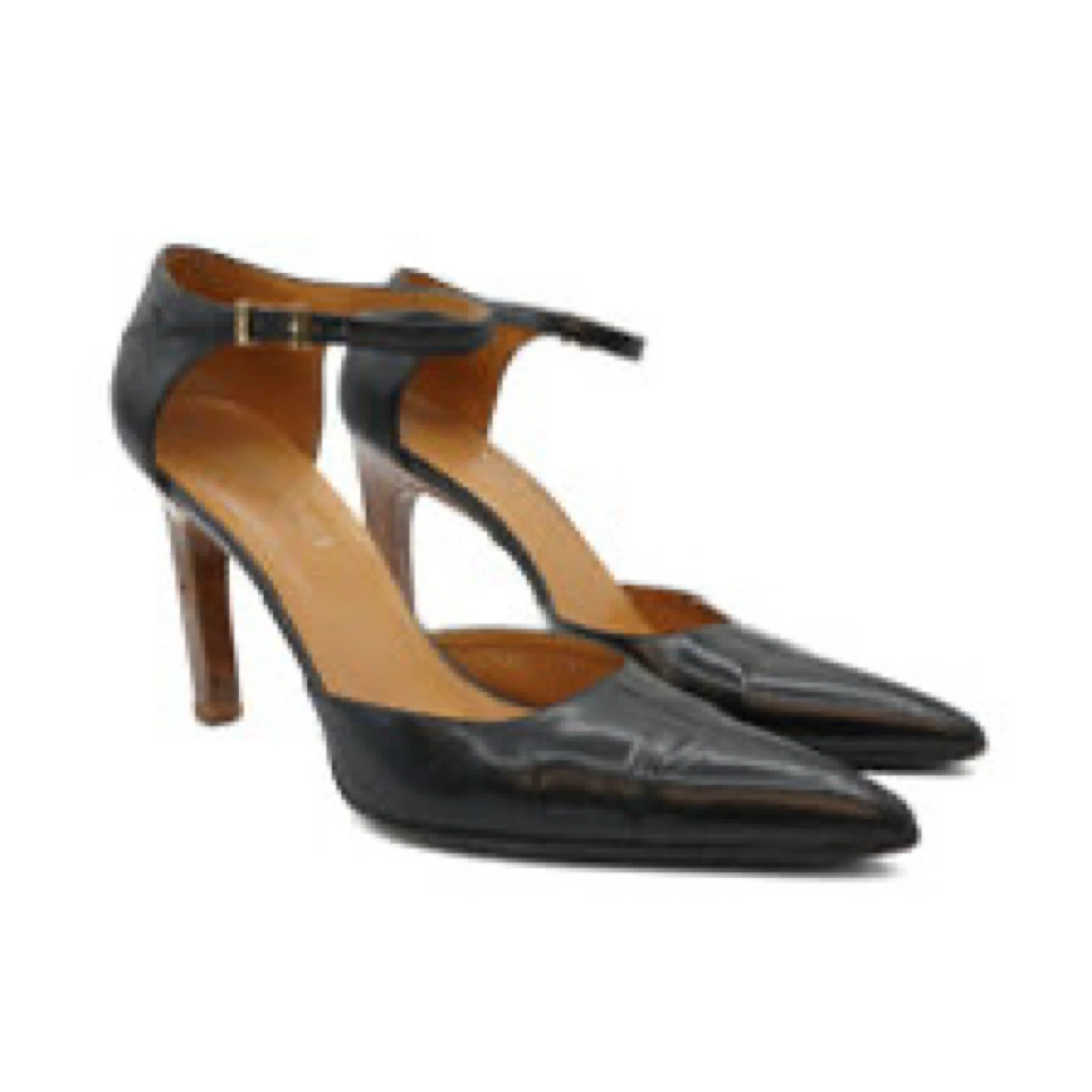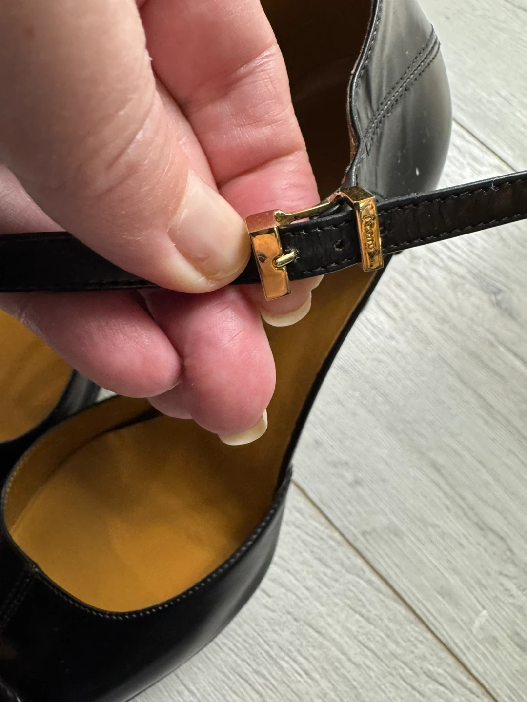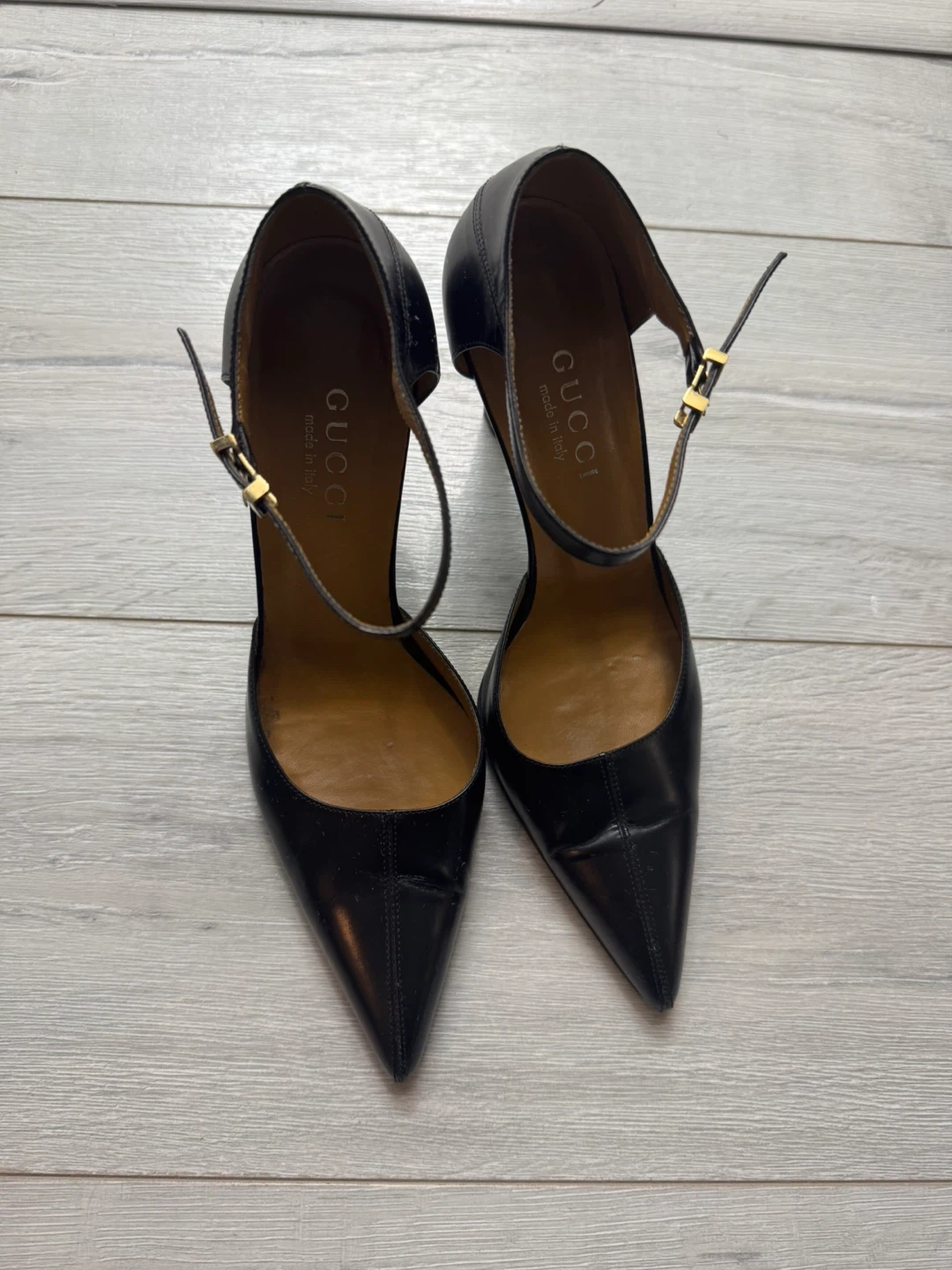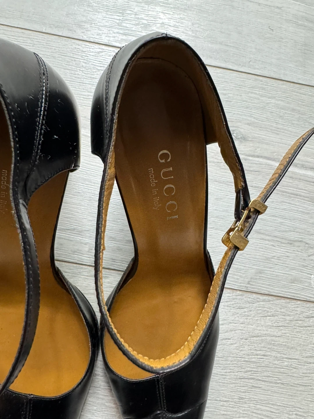 Gucci 'D'Orsay' pointed toe heels in black leather with ankle strap and buckle in goldhardware. Featuring a light brown stacked wood heel and decortative seam down the front of the shoe. Pre loved.