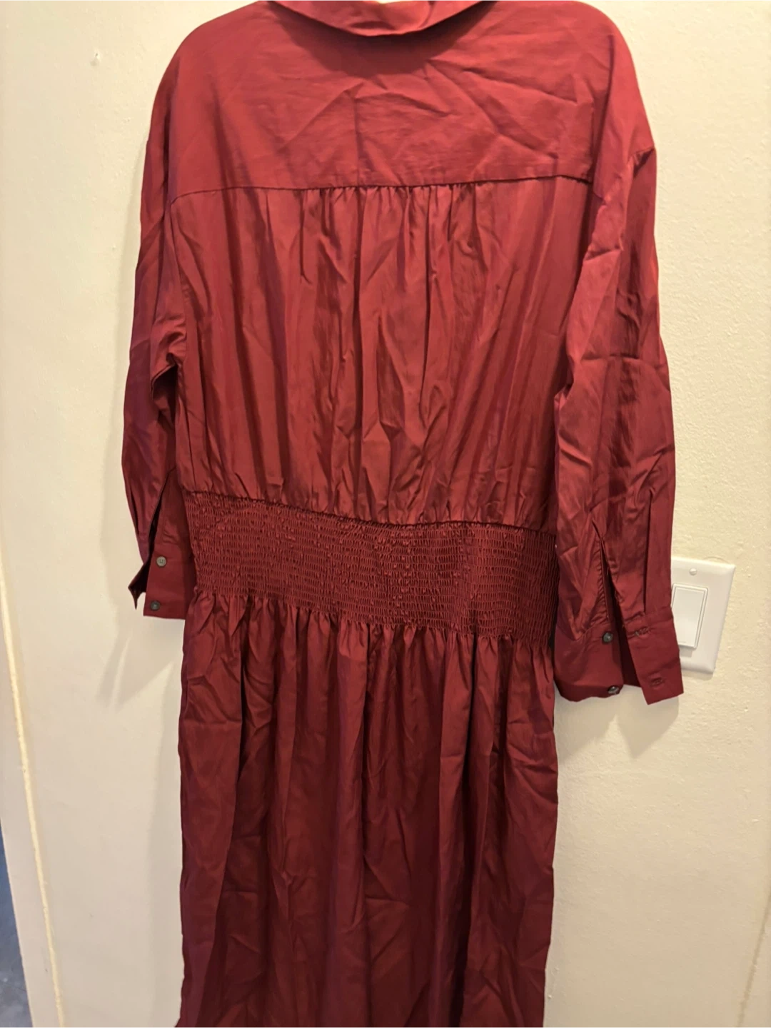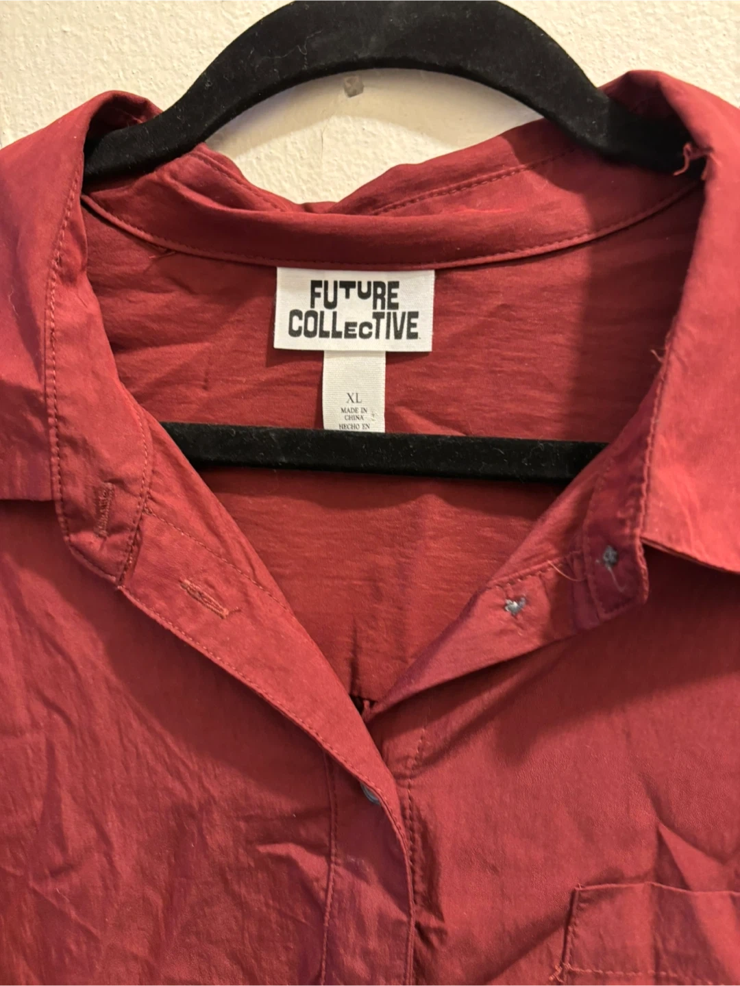 I'm selling a maroon dress from Future Collective in size XL. It features a button-up front and a comfortable, flowy fit. Perfect for a casual day out or dressed up for an evening!