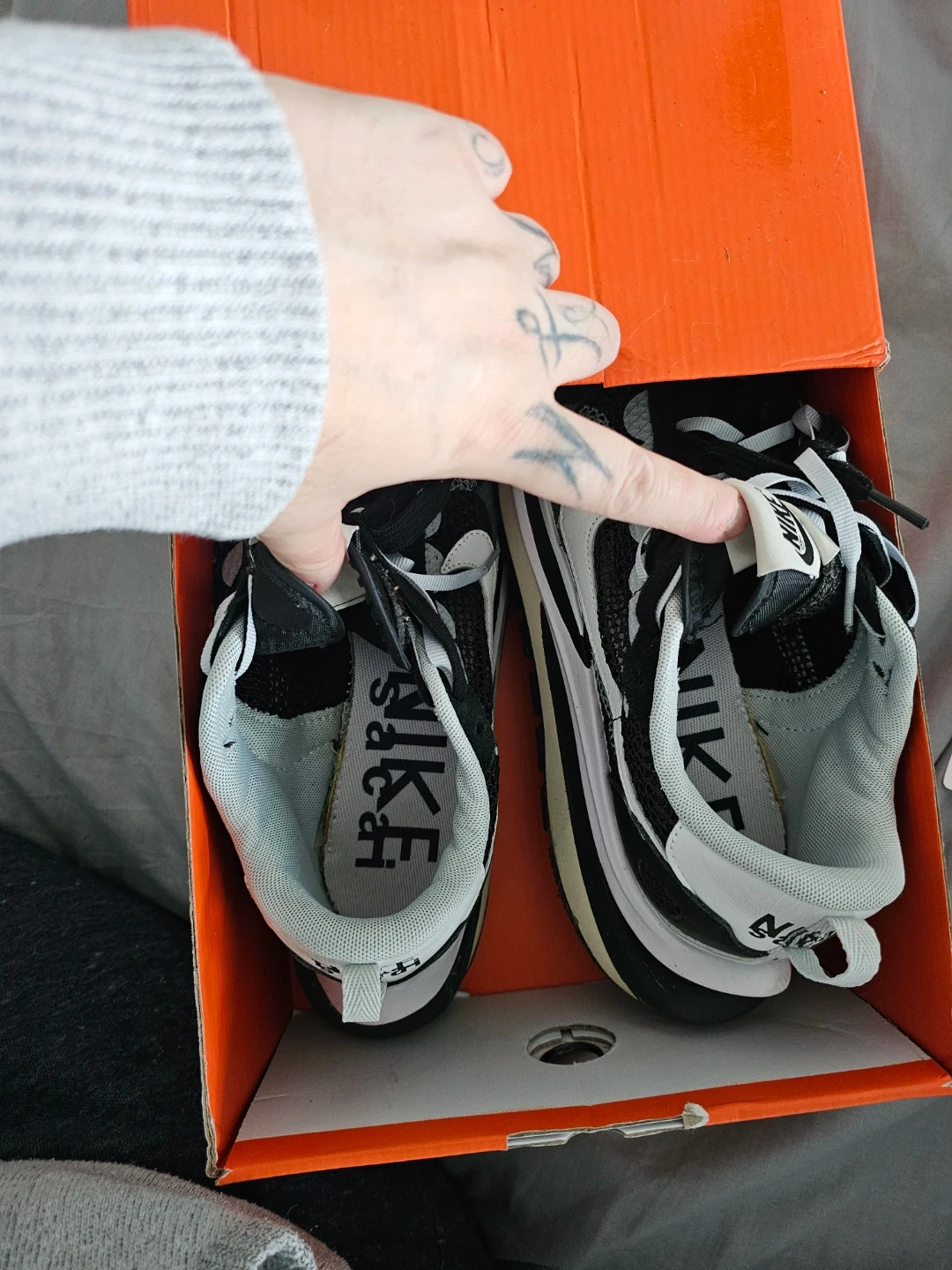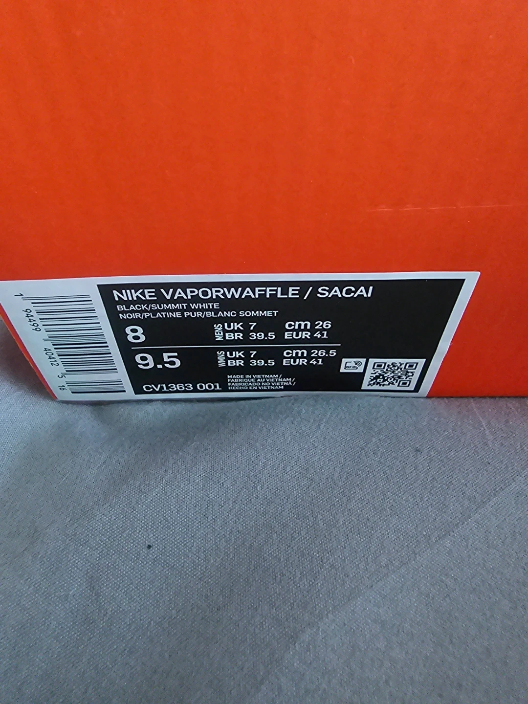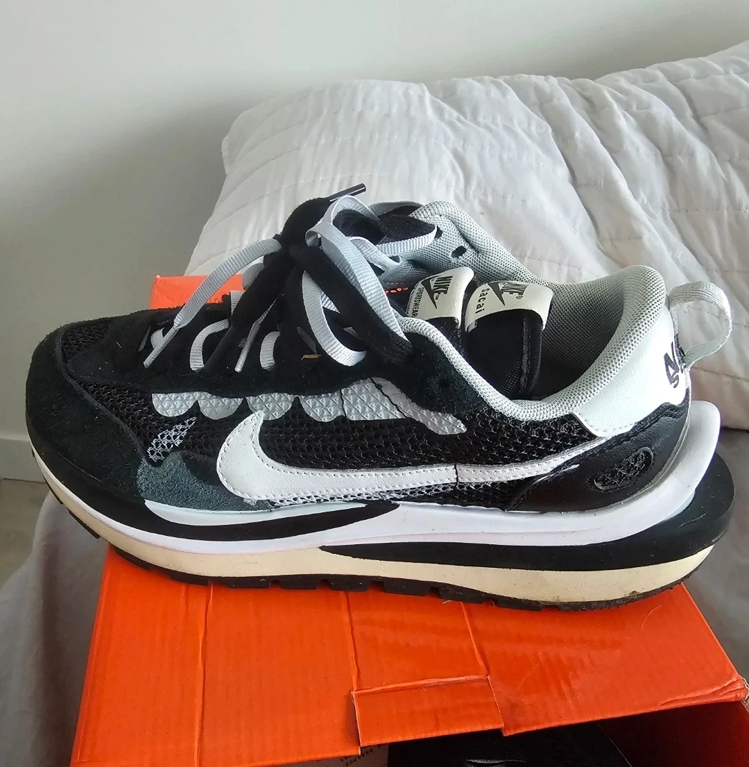 Selling a pair of Nike Vaporwaffle Sacai sneakers in black and summit white, size US 8! They come with the original box and an extra pair of laces. These are a stylish and comfortable choice for everyday wear!