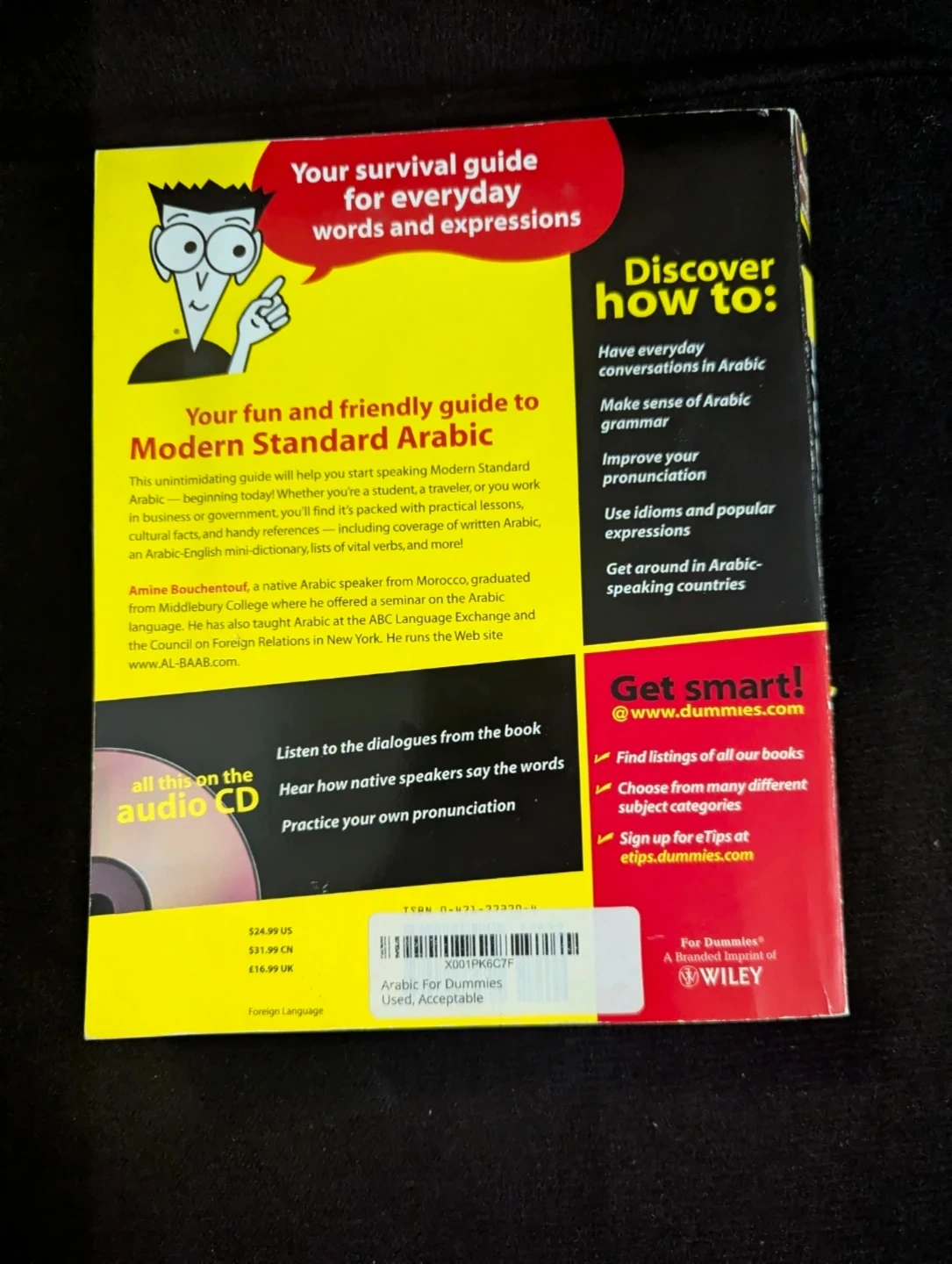 Selling a copy of "Arabic for Dummies". This book includes dialogues from the book on audio CD. It is your fun and friendly guide to Modern Standard Arabic and teaches you to have everyday conversations in Arabic.