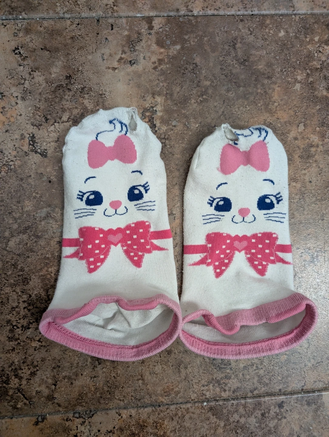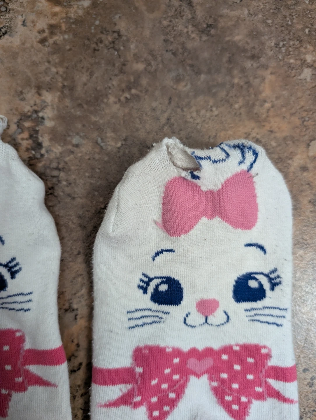 Cute pair of Disney socks featuring Marie the cat! They are white with pink accents and a sweet Marie design. There is a hole on the top of one sock.