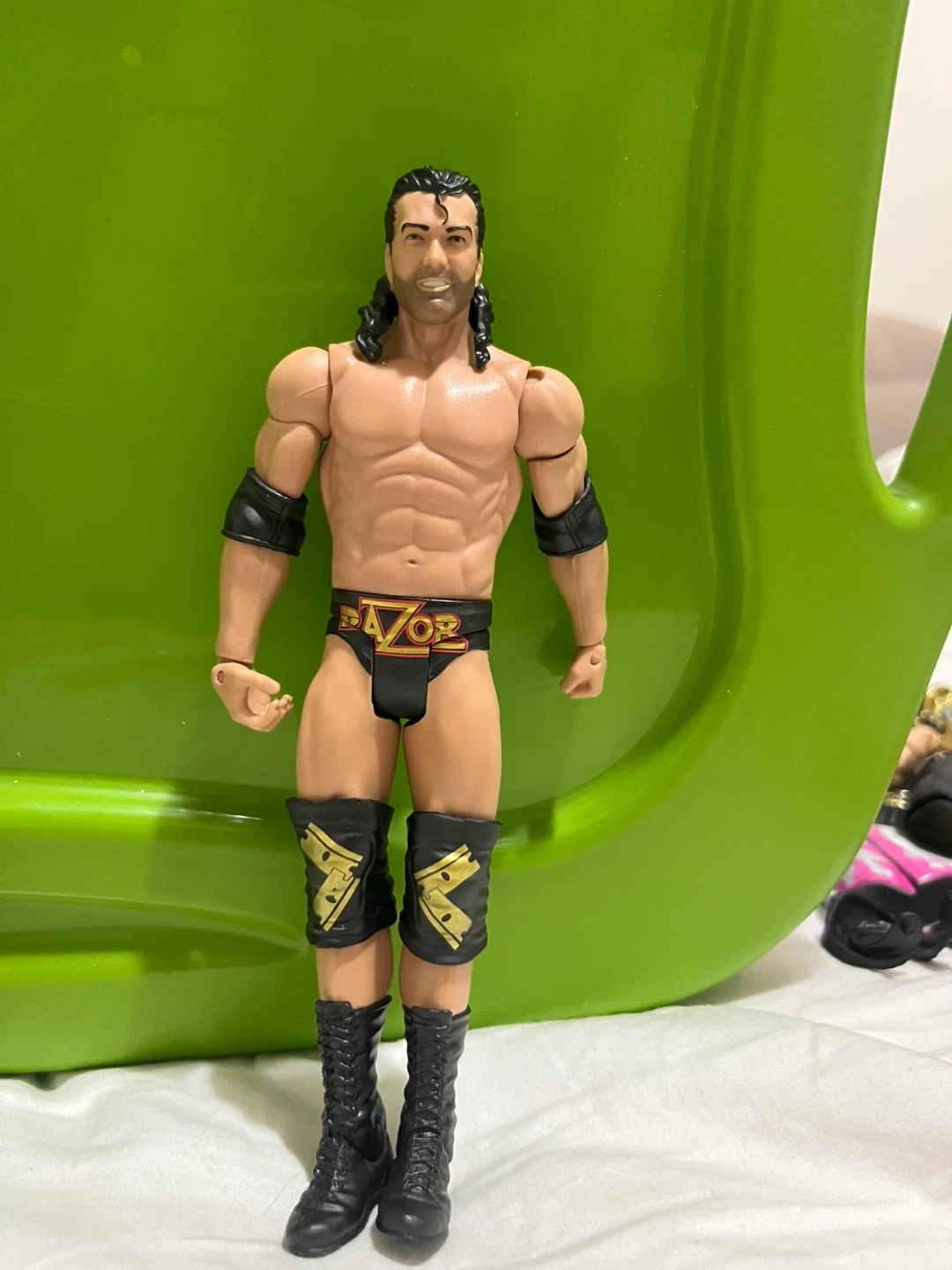 Selling a WWE Razor Ramon action figure. It features his signature look with black trunks and knee pads. Great for any wrestling fan or collector!