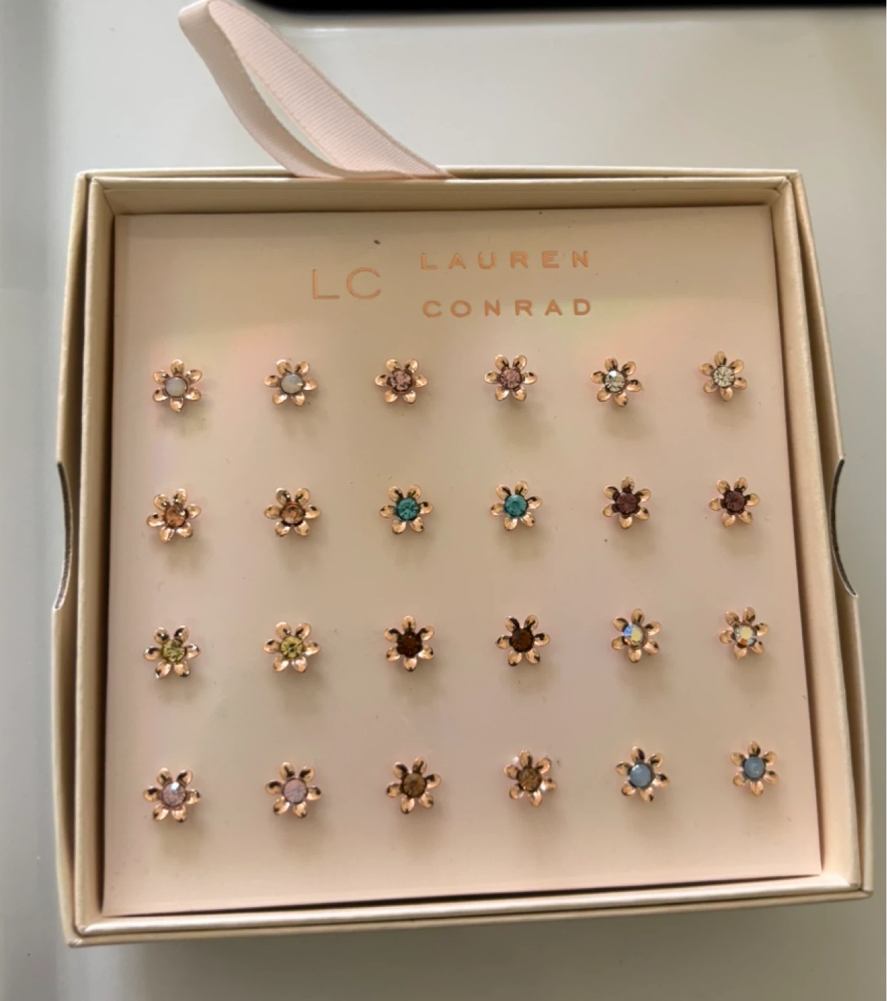 Selling a brand new set of Lauren Conrad flower stud earrings! This set comes with a variety of different colored stones in the center of each flower. The box is included. Originally bought for $22
