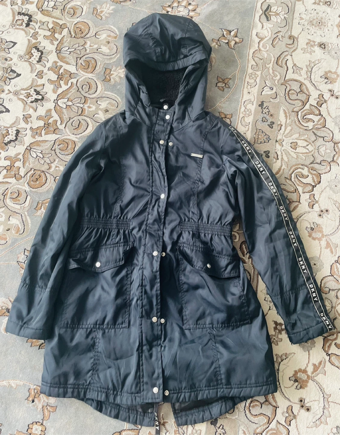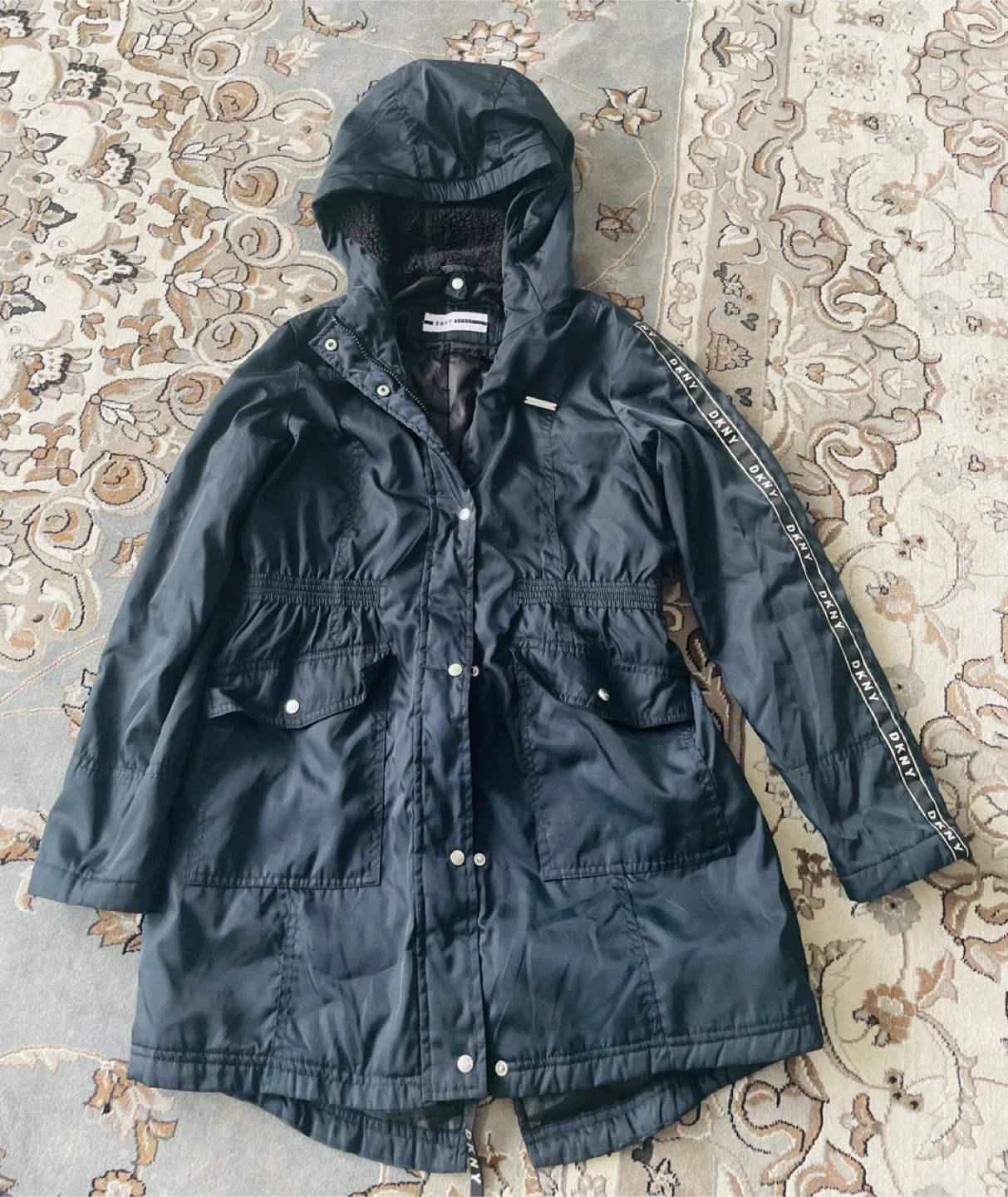 Selling a DKNY black spring/winty coat! It's in great condition and perfect for the colder weather. The coat features a hood and the DKNY logo is visible on the sleeves. A stylish and practical addition to your wardrobe!