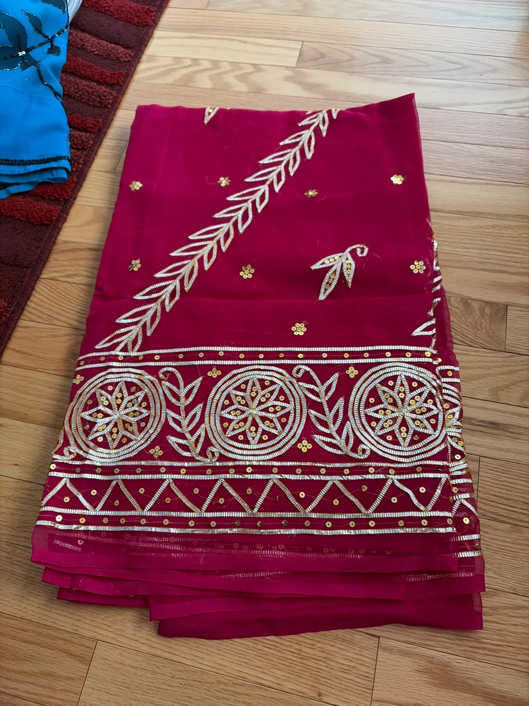 Beautiful red saree with intricate gold and silver embroidery! The fabric is lightweight and flowy, perfect for any special occasion or cultural event. The design features traditional motifs and patterns, adding a touch of elegance to the saree. It's in great condition and ready to be worn