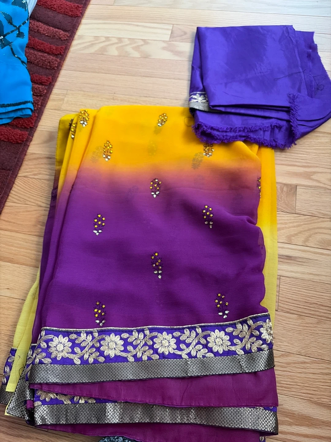 Beautiful saree in a vibrant yellow and purple gradient with delicate floral embellishments! Includes a matching blouse piece in solid purple. The saree features an elegant floral border with silver detailing. Perfect for special occasions or adding a touch of colour to your wardrobe