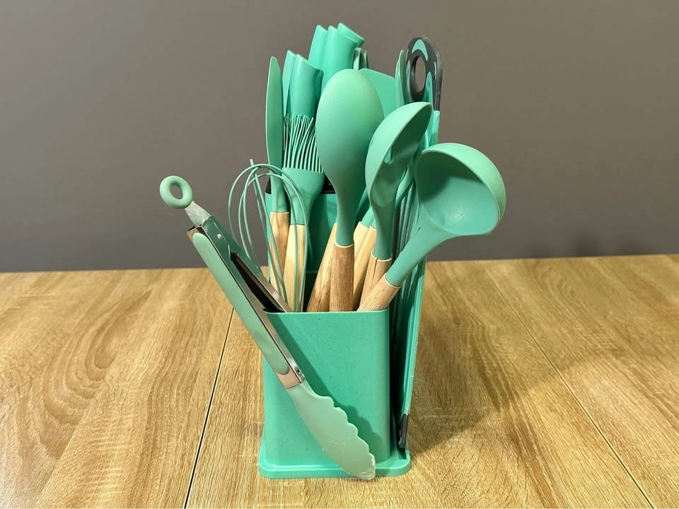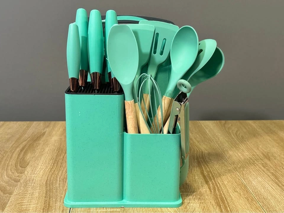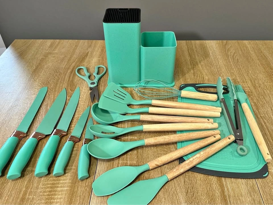 Awesome green cutlery and knife set! I’ve used these for a few months so the cutting board definitely has lines on it. Wood handles+Silicon Cultery & Plastic handles for the knives.