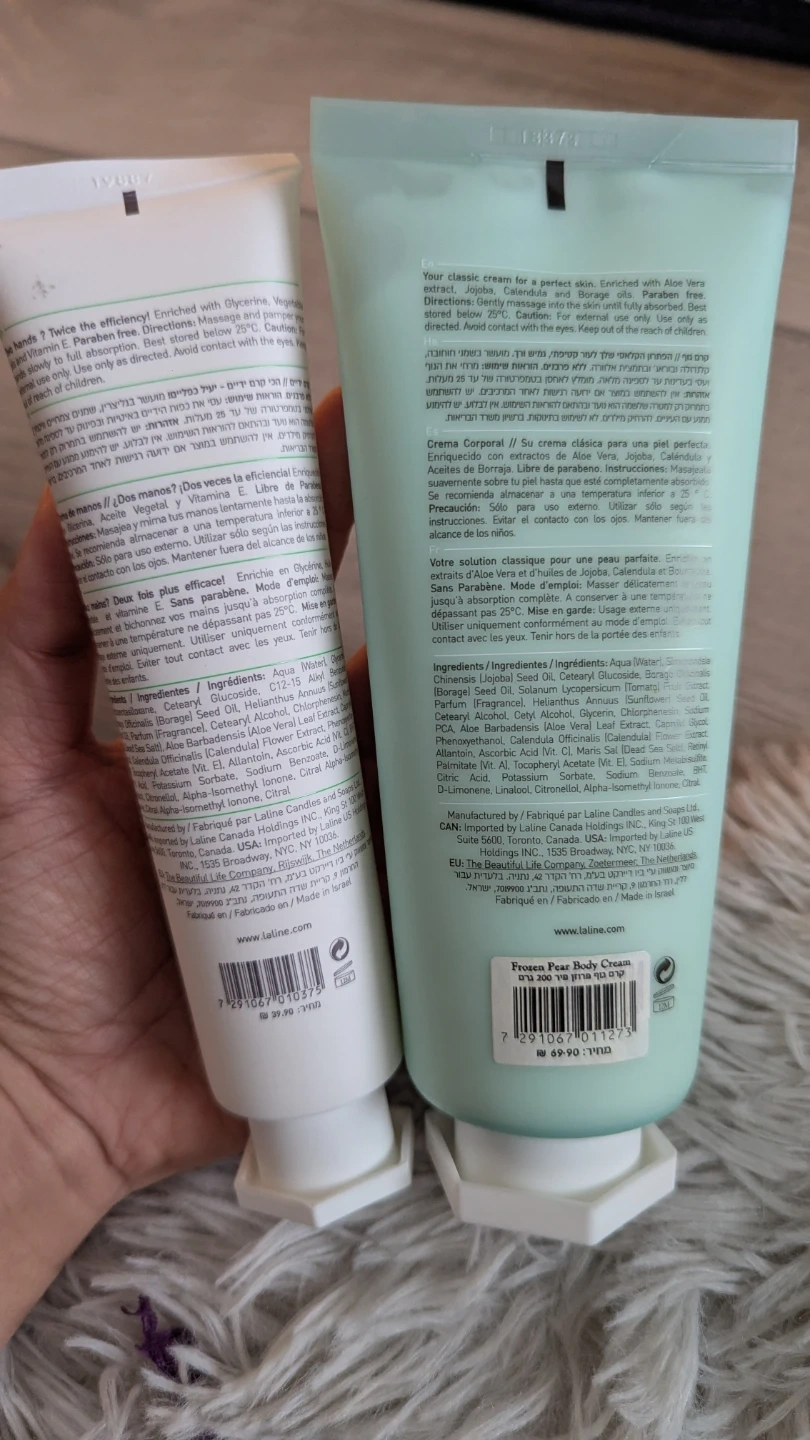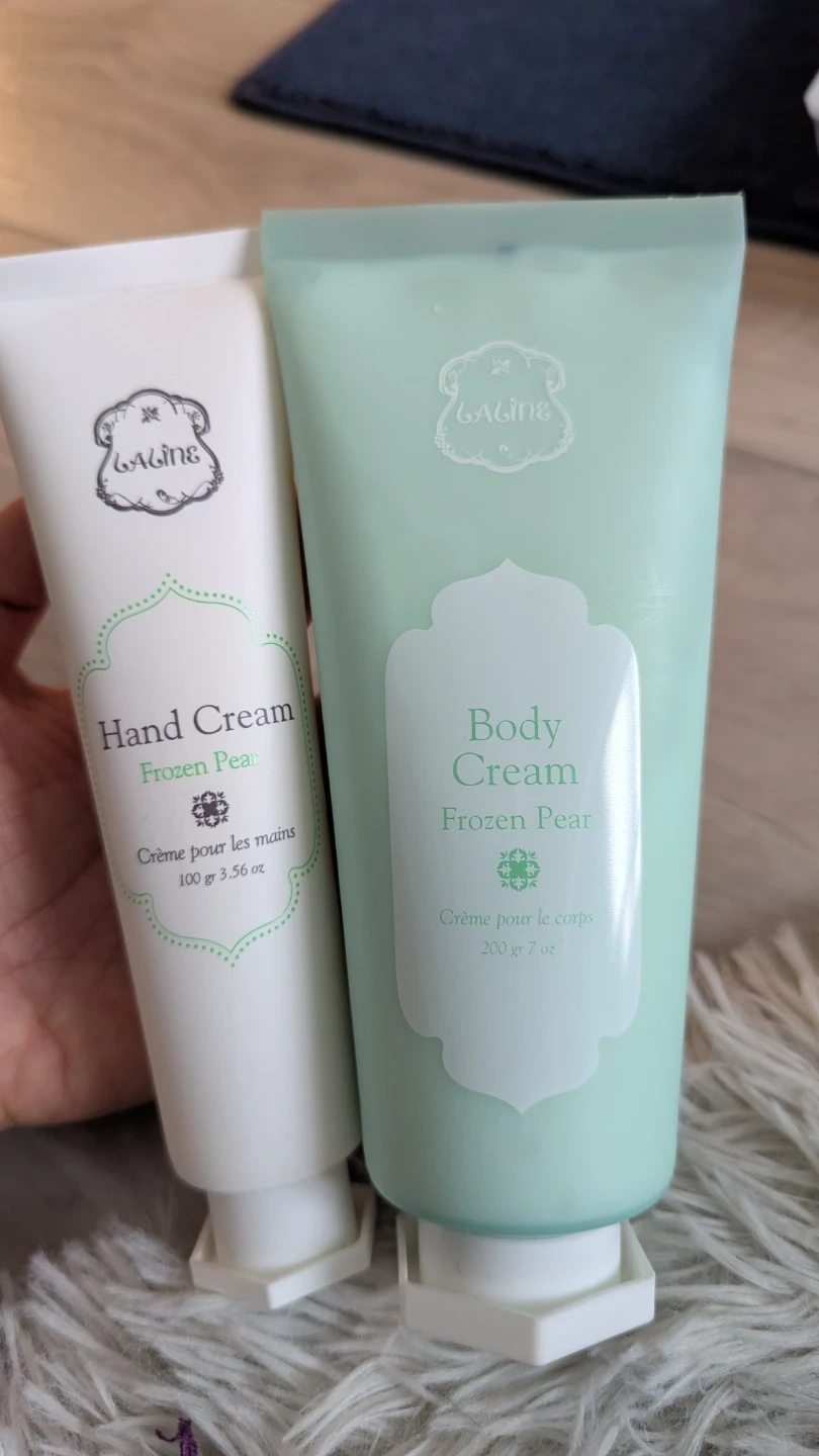 Here's a brand new, unopened set of Laline creams in the Frozen Pear scent! This includes a hand cream (100g) and a body cream (200g). Get both for a great price - Perfect for keeping your skin moisturized and smelling great!